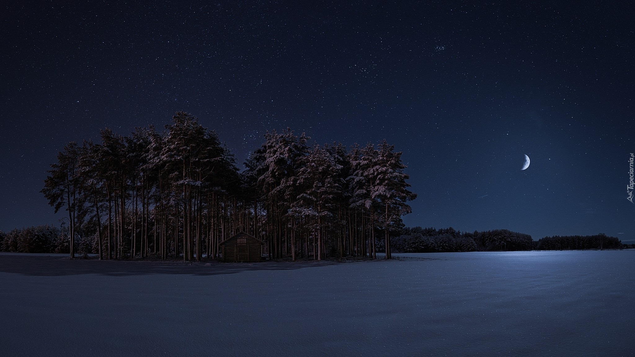 Edytor tapety: Nocny księżyc oświeca zaśnieżone pole i drzewa