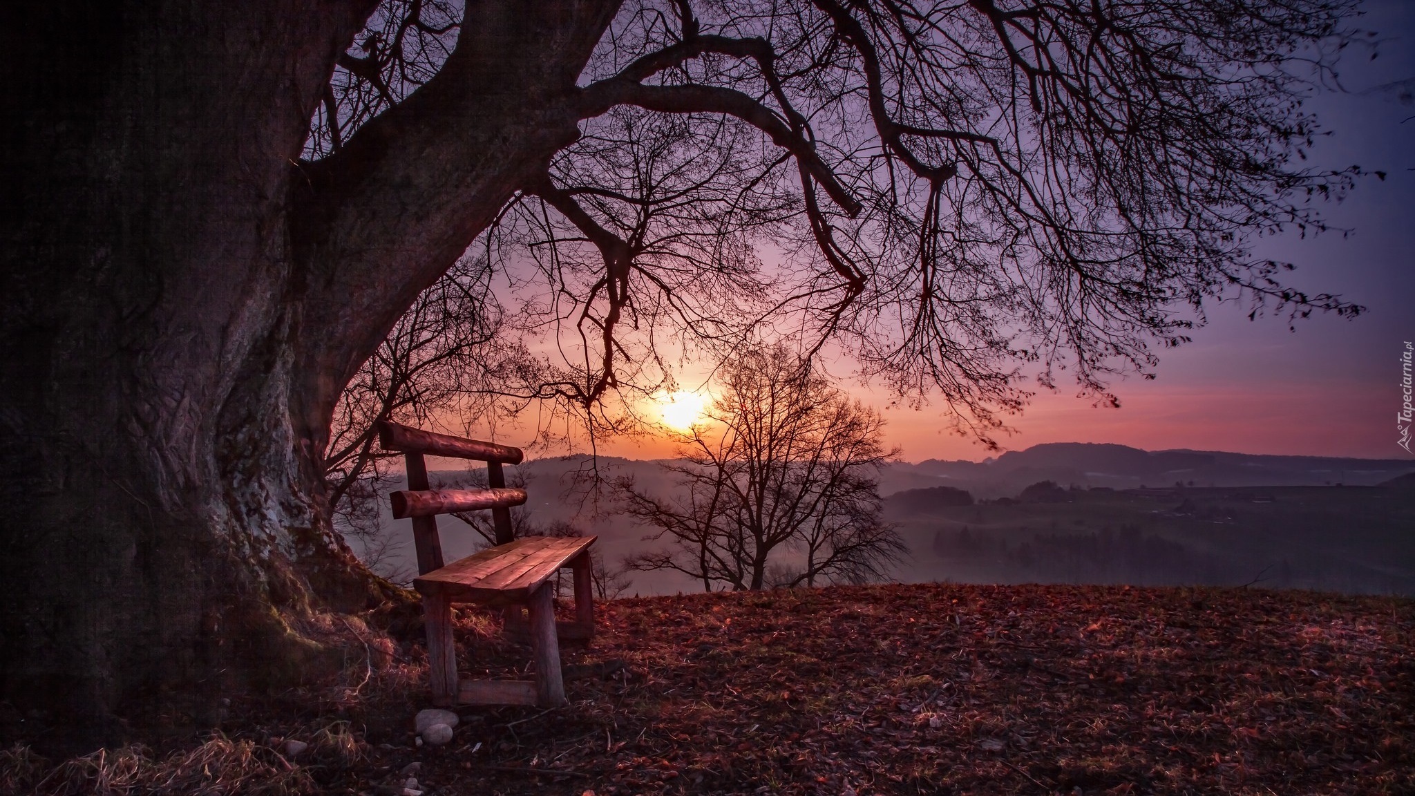 Edytor tapety: Ławeczka pod jesiennym drzewem o zachodzie słońca