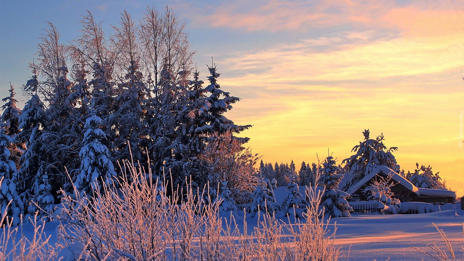 Edytor tapety: Zimowy krajobraz z domem w otoczeniu drzew