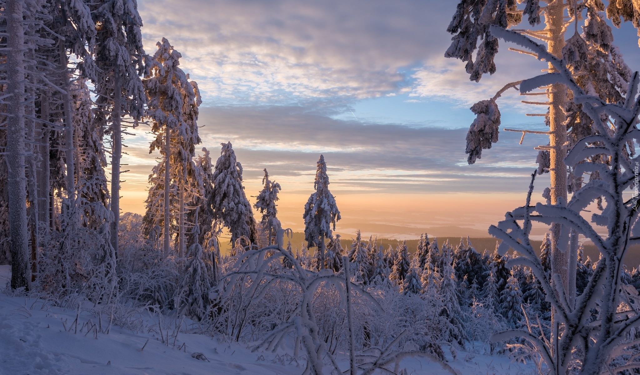 Edytor tapety: Ośnieżone drzewa o wschodzie słońca