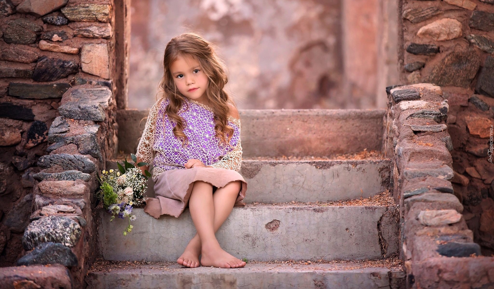 Edytor tapety: Bosonoga dziewczynka z bukietem kwiatów siedzi na schodach