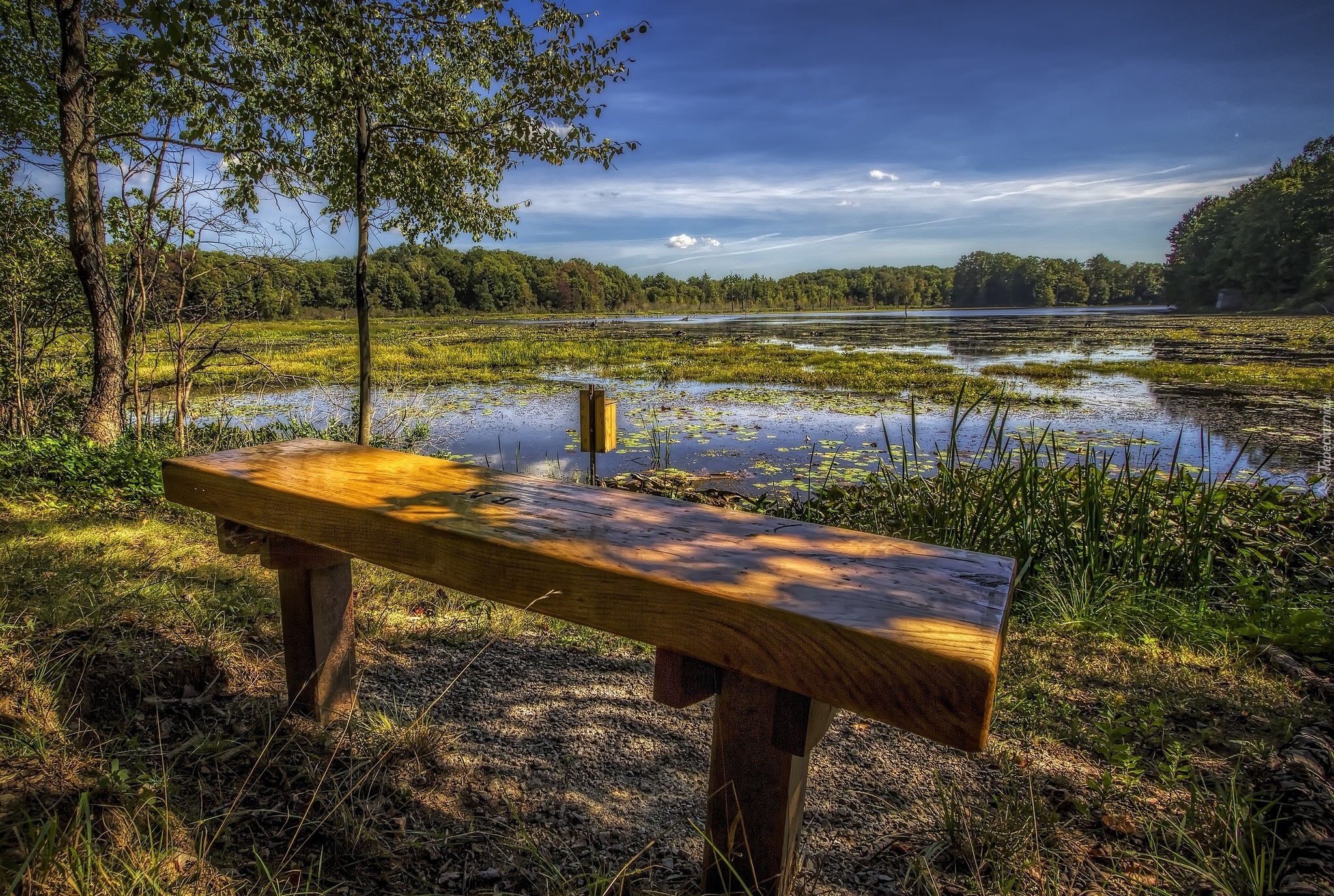 Edytor tapety: Widok z ławeczki na jezioro i las