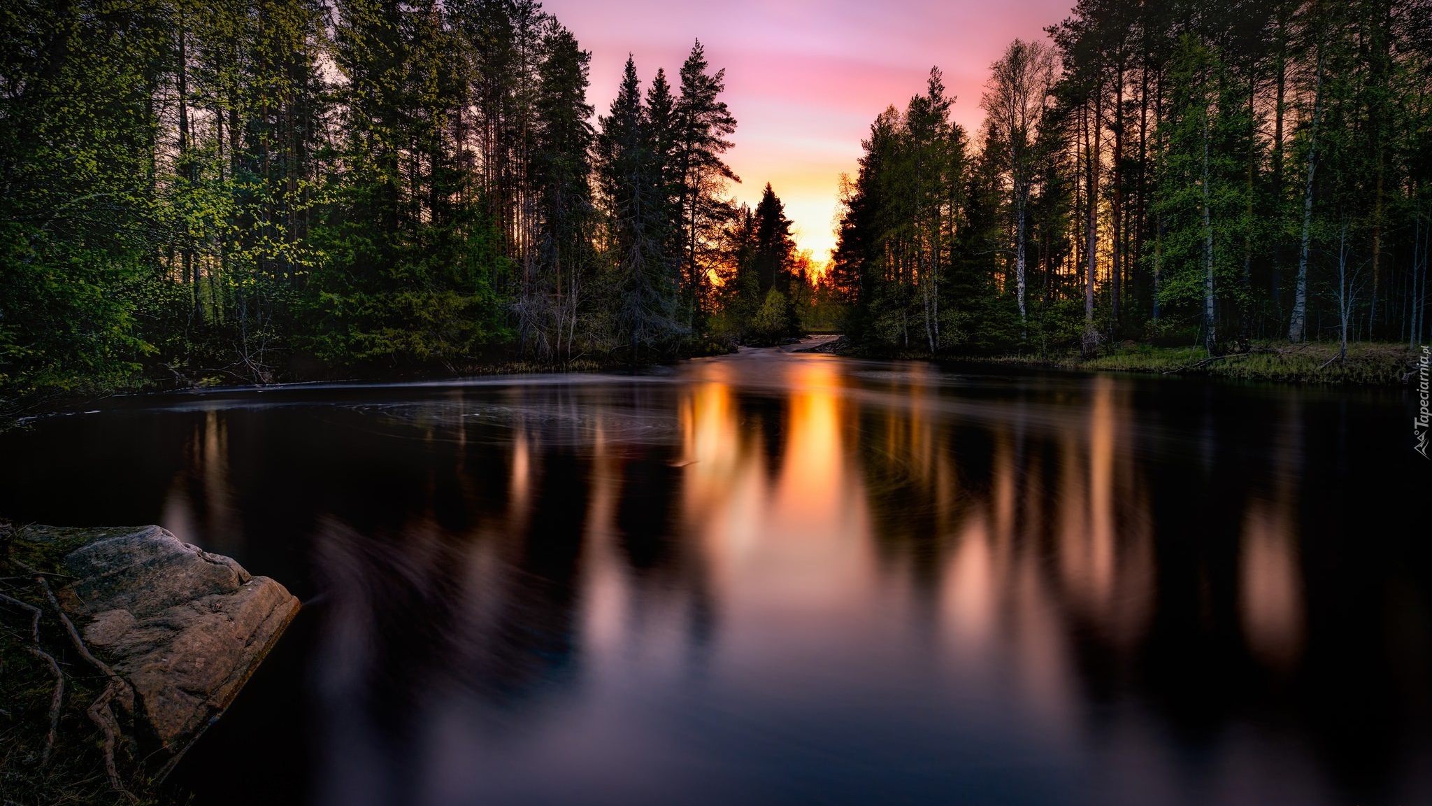 Edytor tapety: Zachodzące słońce chowa się w leśnym jeziorze