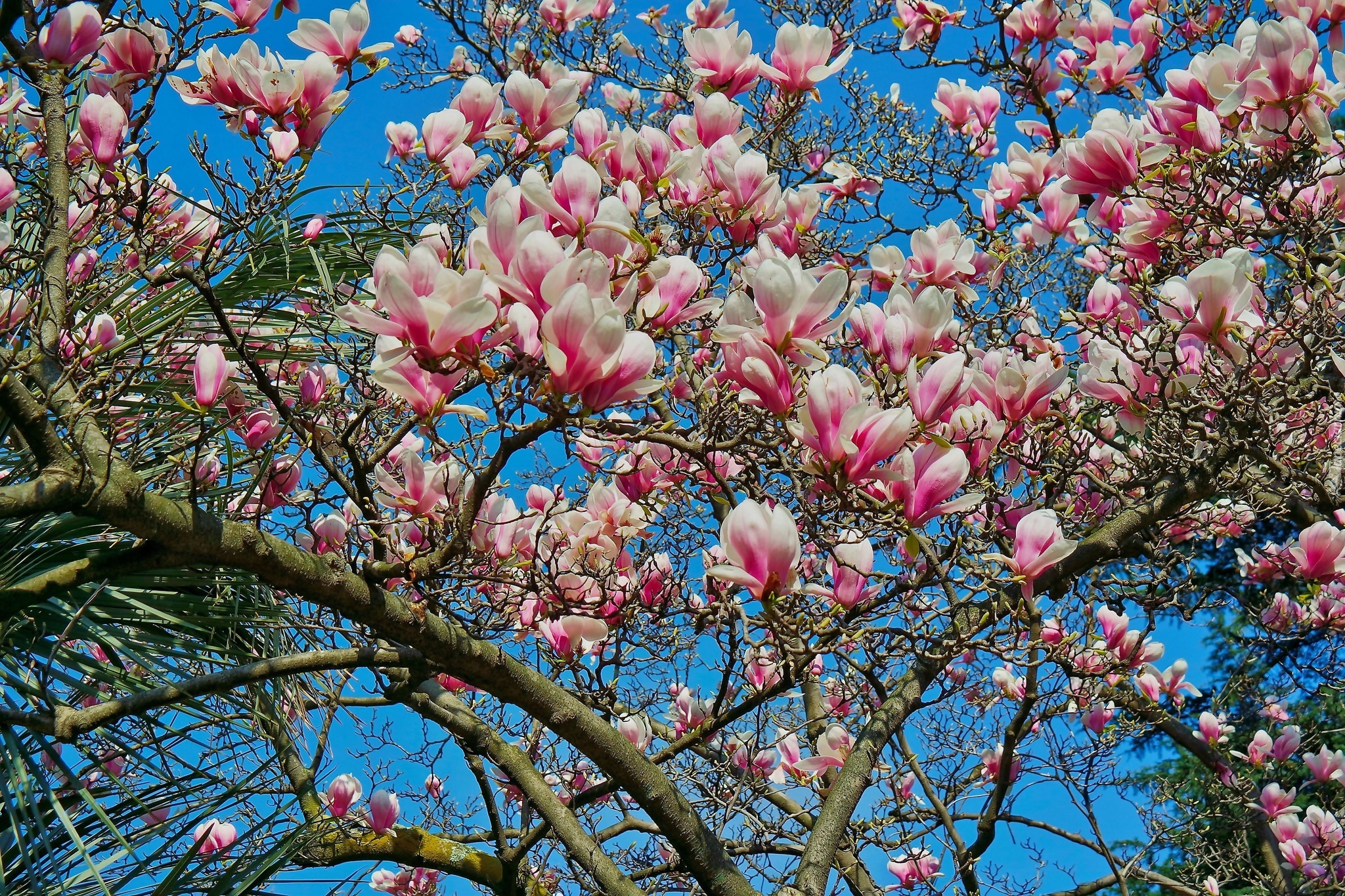 Edytor tapety: Kwitnące kwiaty magnolii na tle wiosennego nieba
