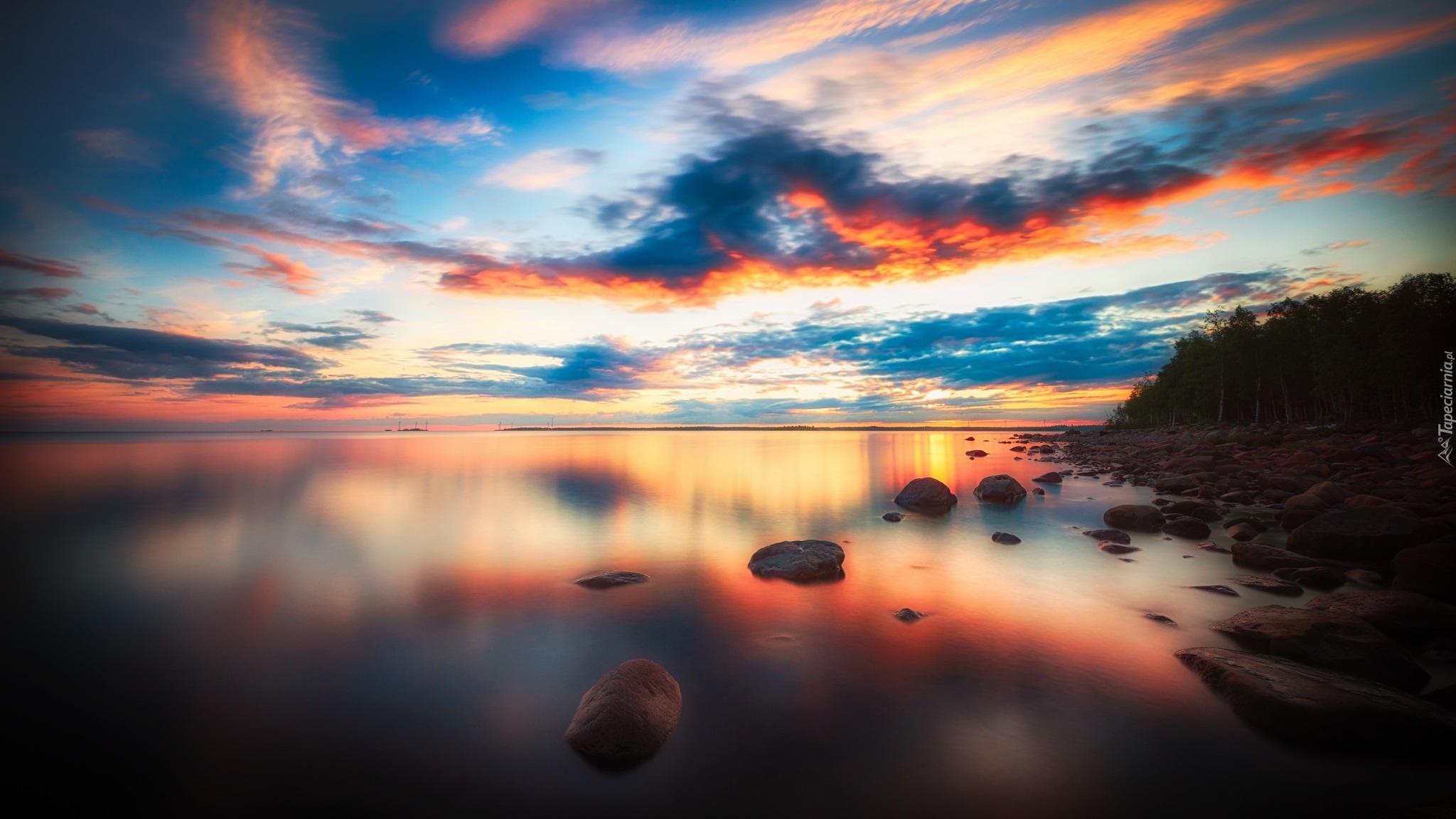 Edytor tapety: Kolorowe niebo nad kamienistym brzegiem morza