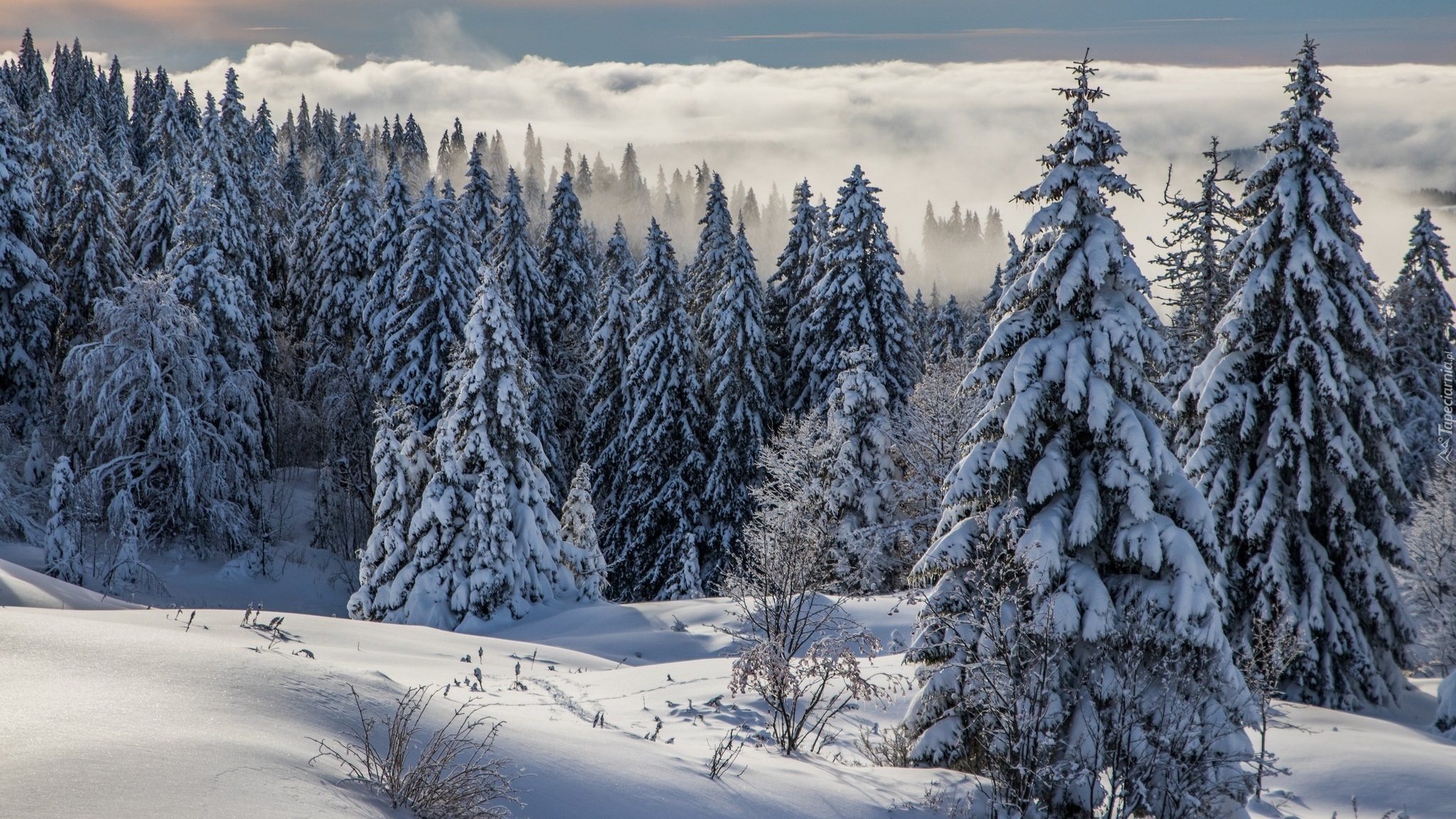 Edytor tapety: Ośnieżone świerki w zamglonych górach