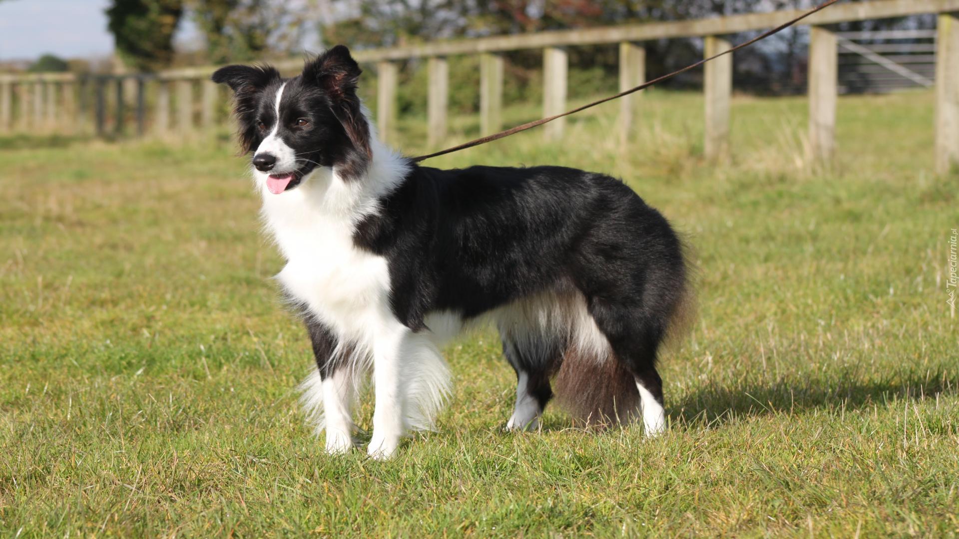 Edytor tapety: Border collie trzymany na smyczy stoi na łące