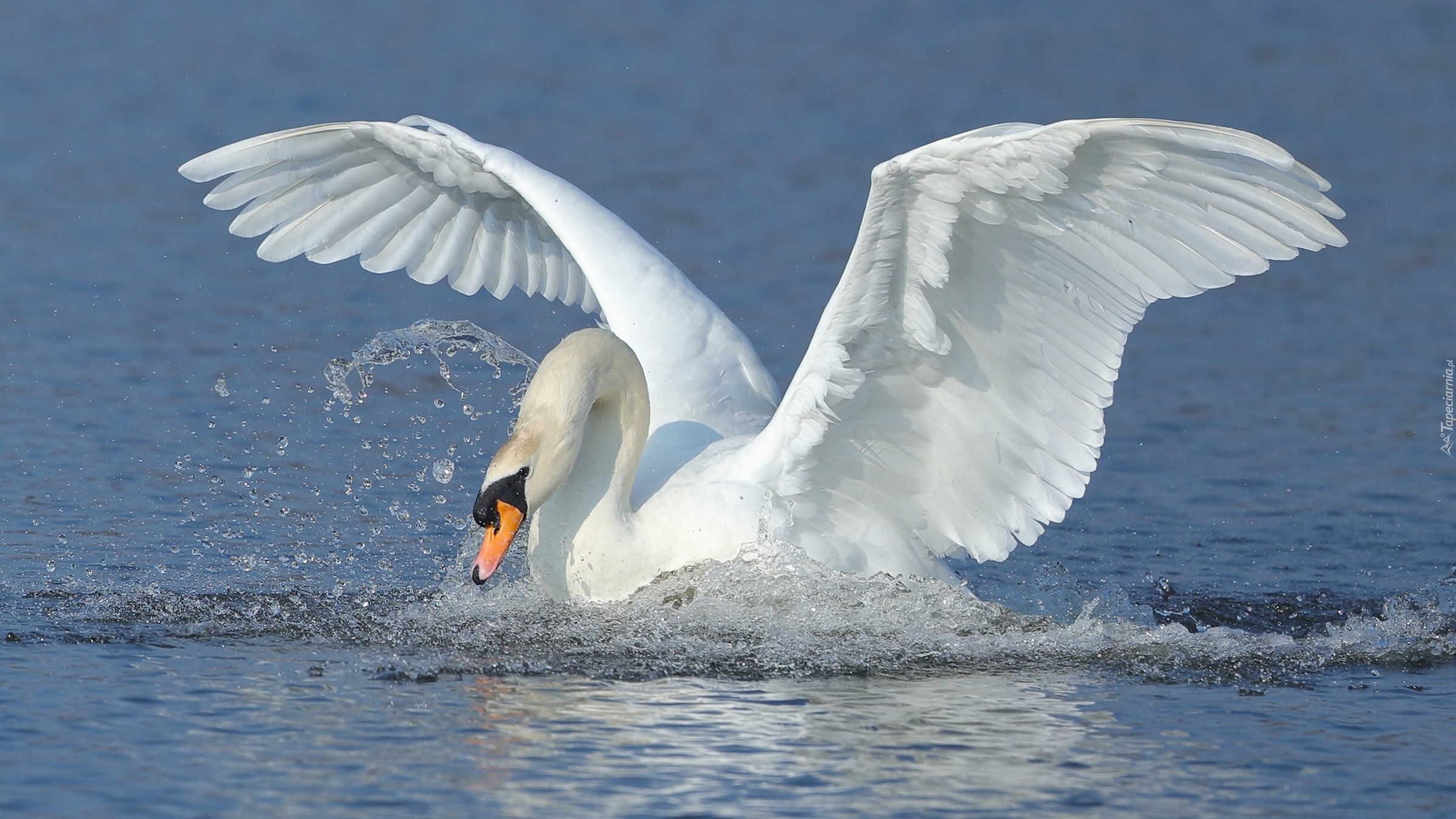 Edytor tapety: Biały łabędź z rozpostartymi skrzydłami
