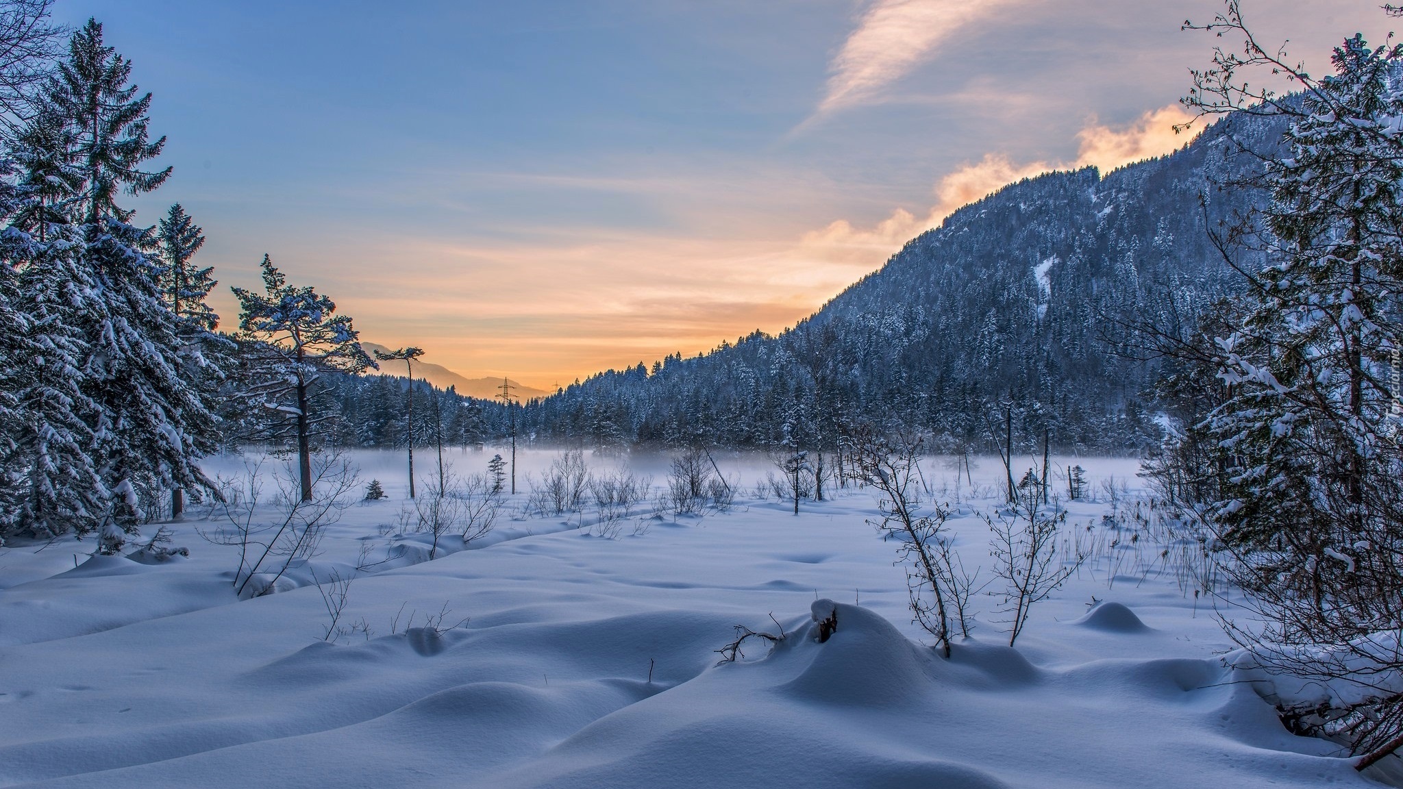 Edytor tapety: Zaśnieżone góry porośnięte drzewami