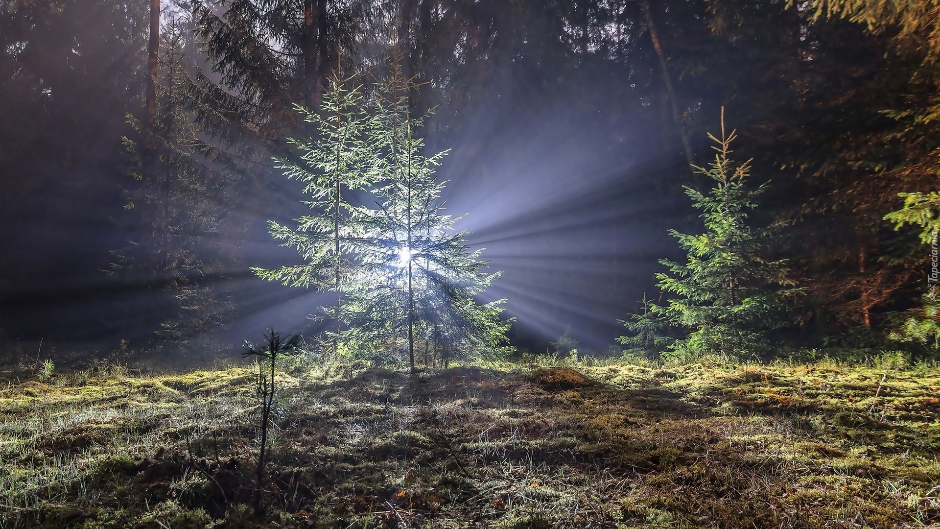 Edytor tapety: Leśne drzewa w blasku promieni słońca