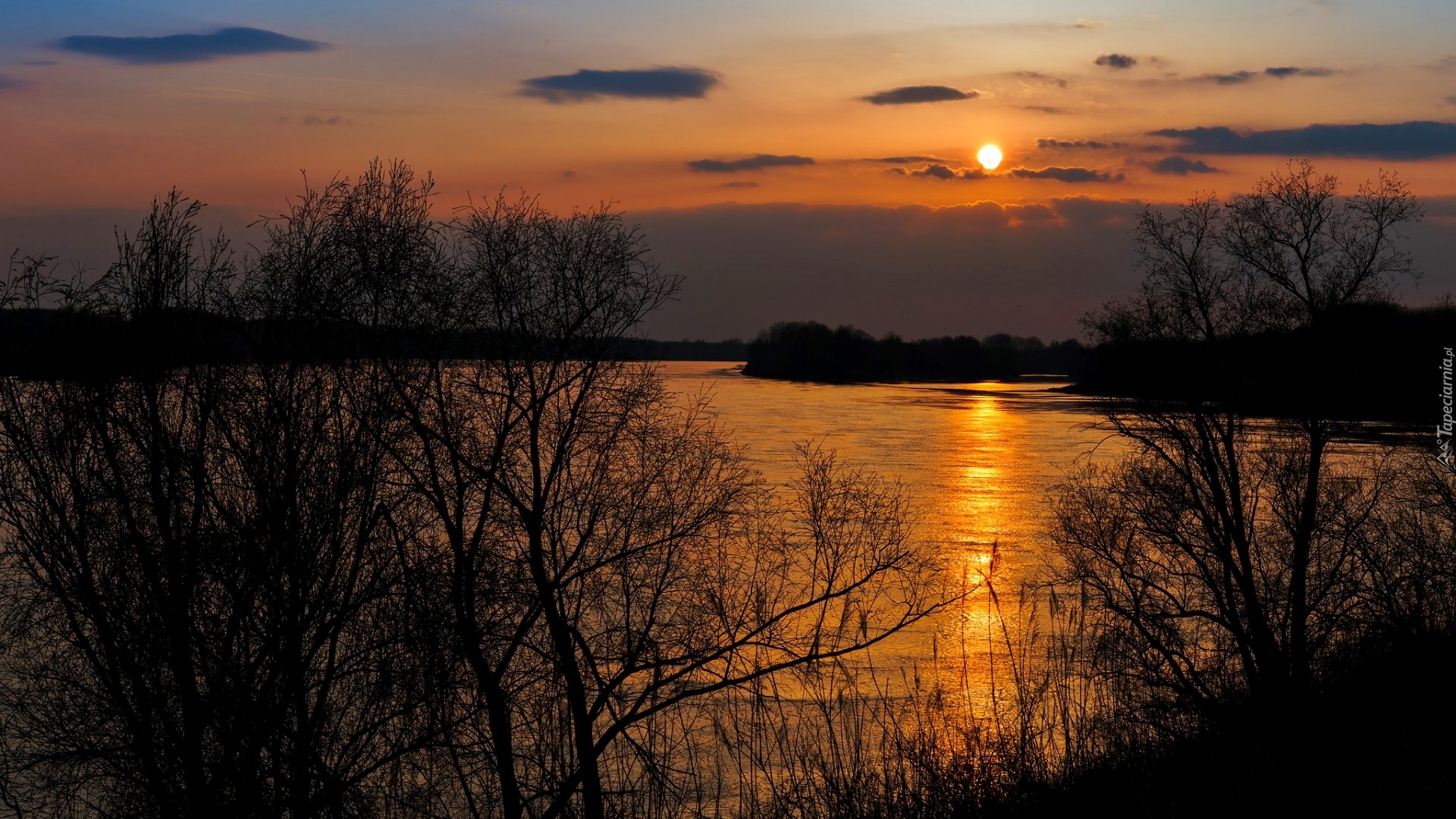 Edytor tapety: Drzewa nad rzeką w blasku słońca