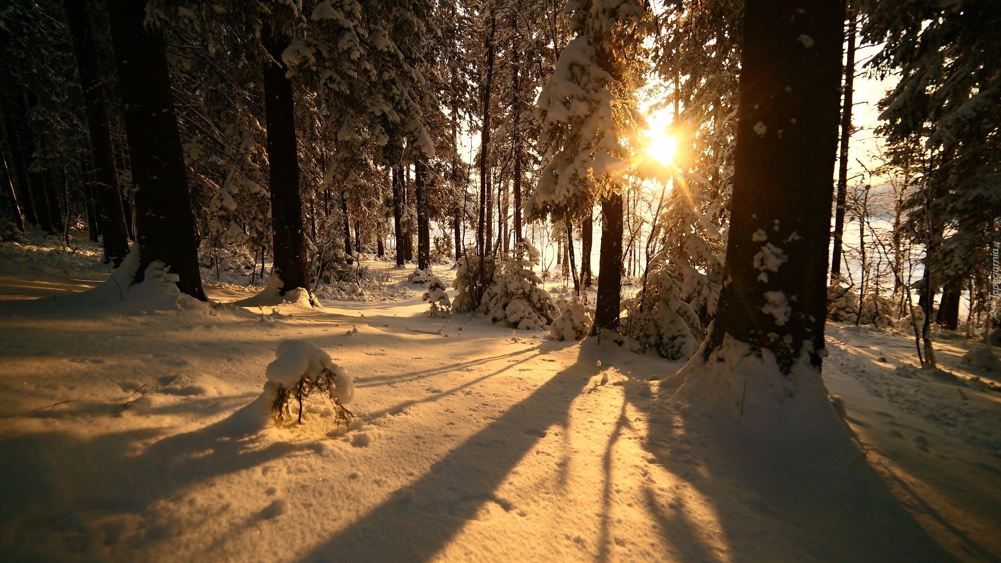 Edytor tapety: Promienie słońca między drzewami oświetlają zaśnieżoną leśną polanę