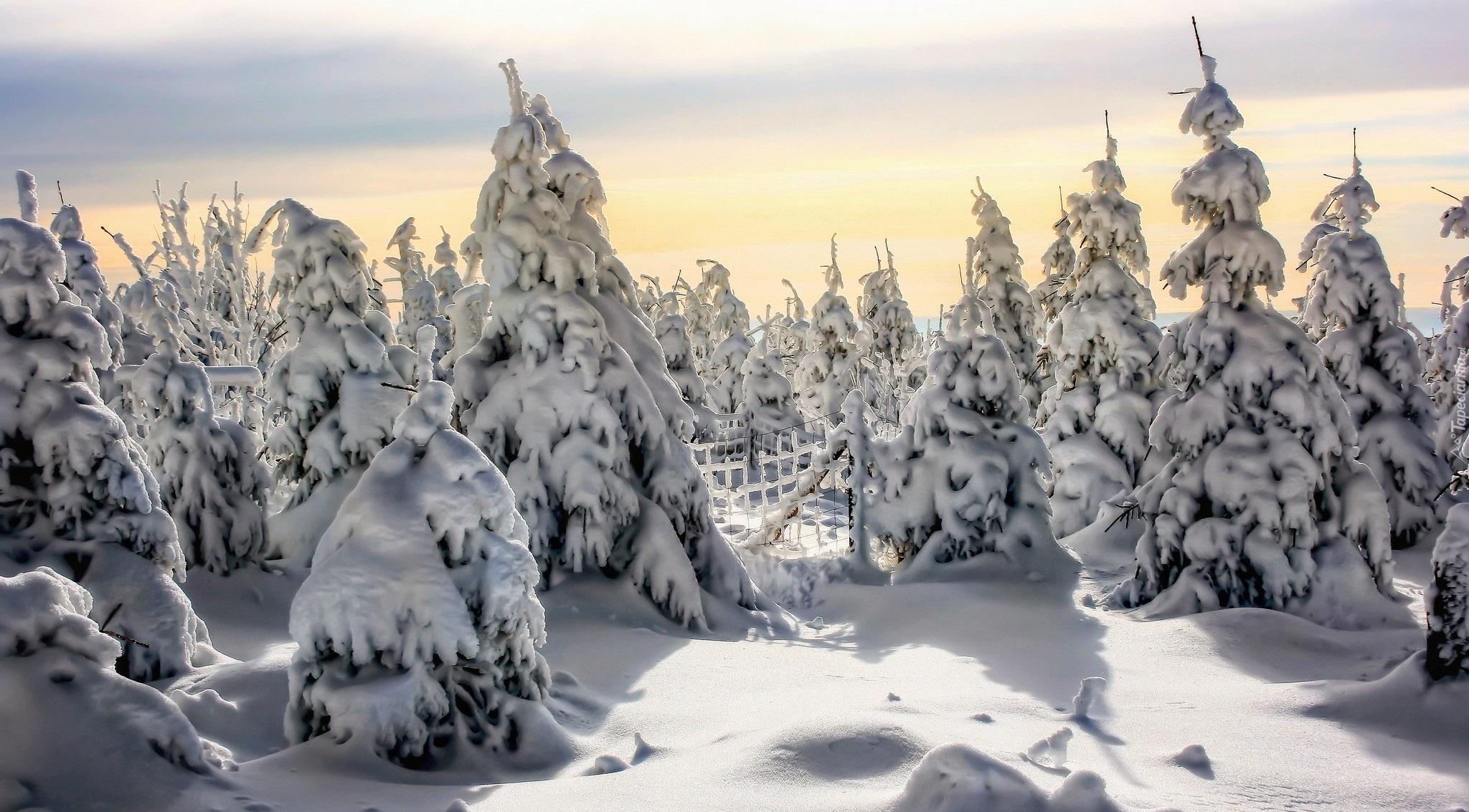 Edytor tapety: Ogrodzone świerki pokryte śniegiem