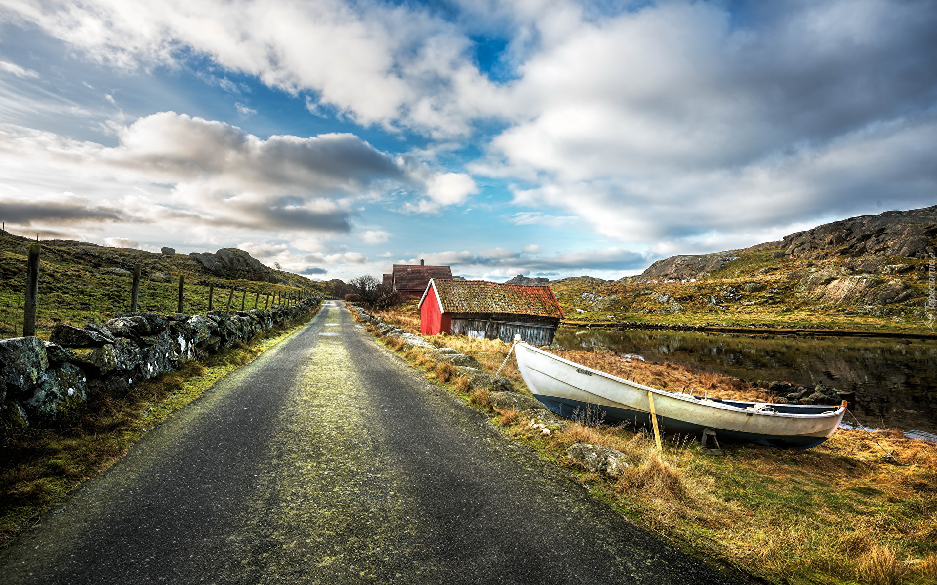Edytor tapety: Łódź i domy przy drodze w norweskim Egersund