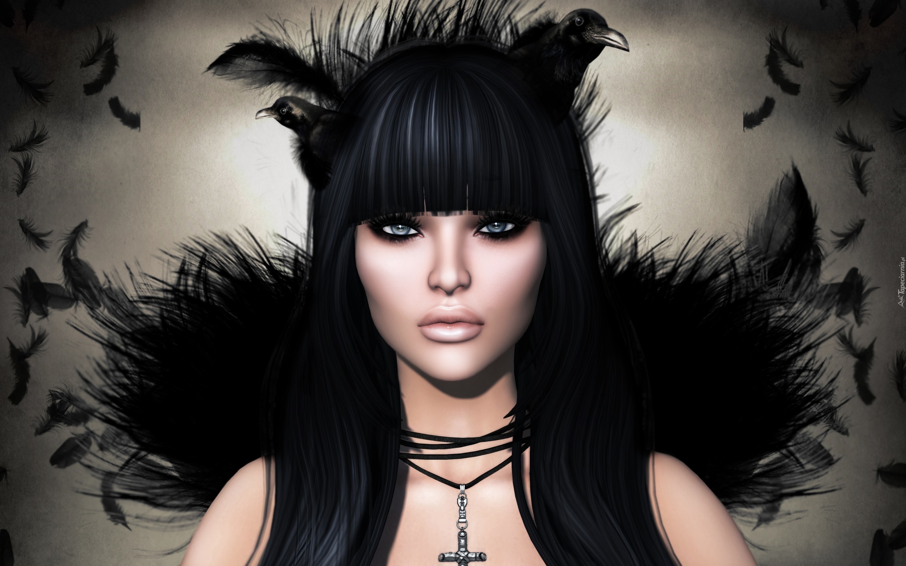 Edytor tapety: Czarnowłosa kobieta i fruwające nad nią pióra