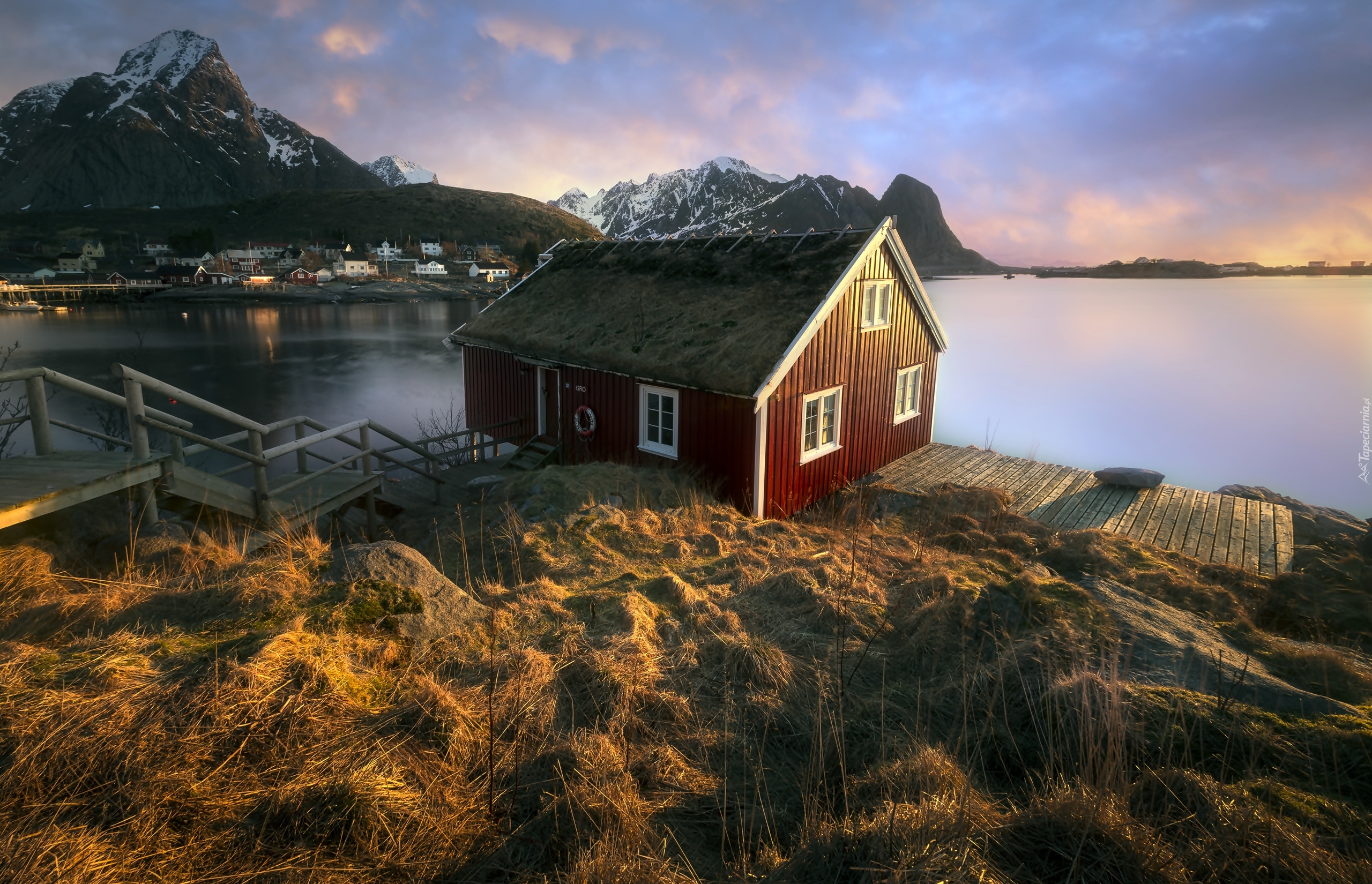 Edytor tapety: Dom nad jeziorem w norweskiej wiosce Reine