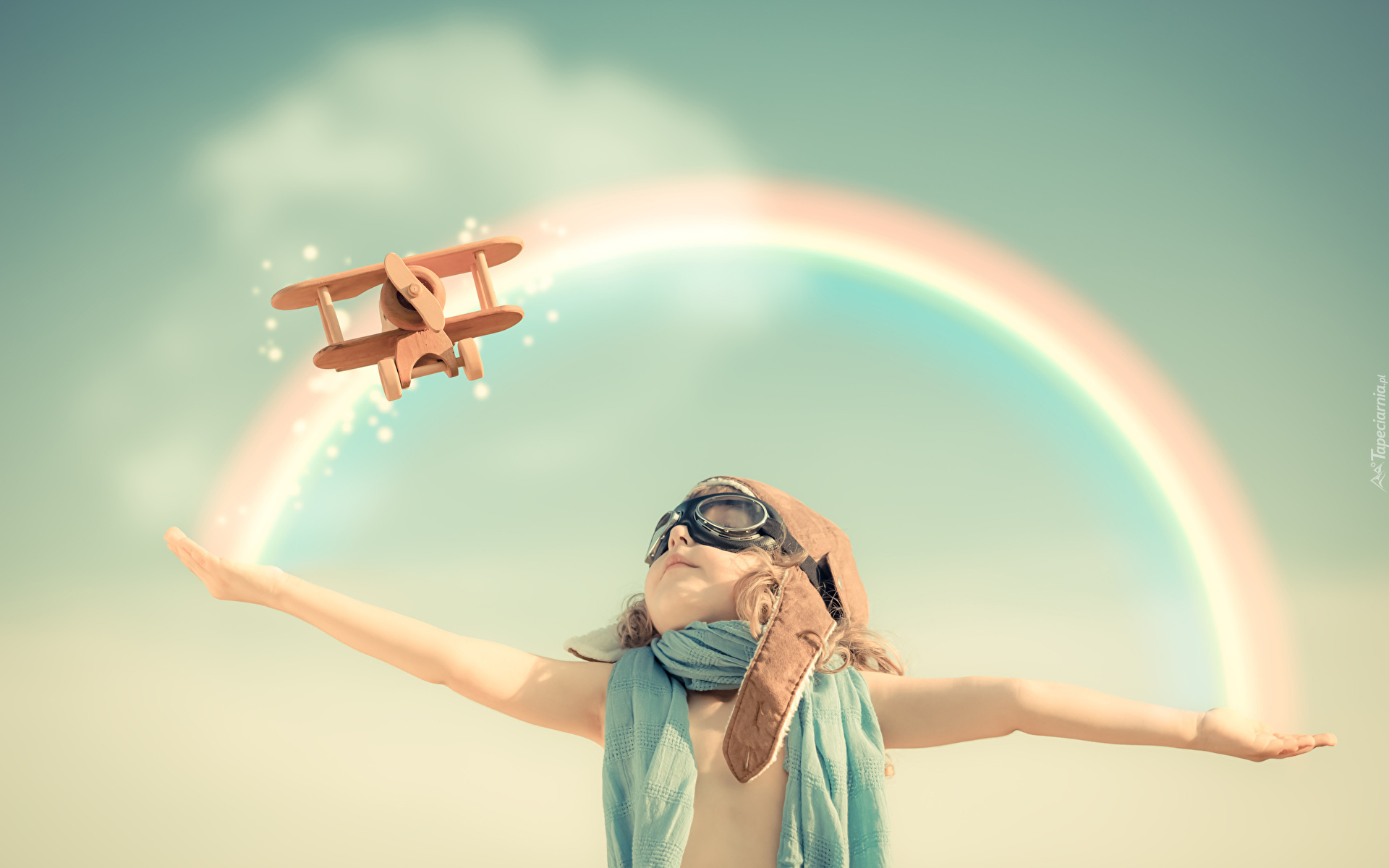 Edytor tapety: Tęcza nad dziewczynką z drewnianym samolotem