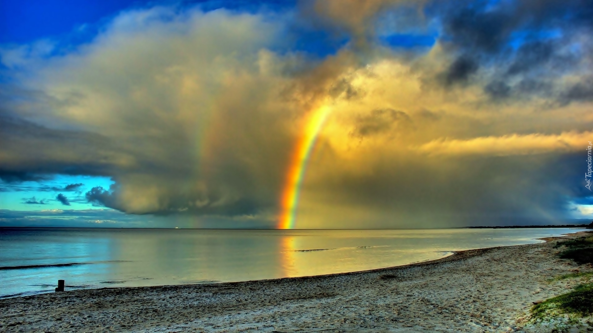 Edytor tapety: Zachmurzone niebo z tęczą nad morzem