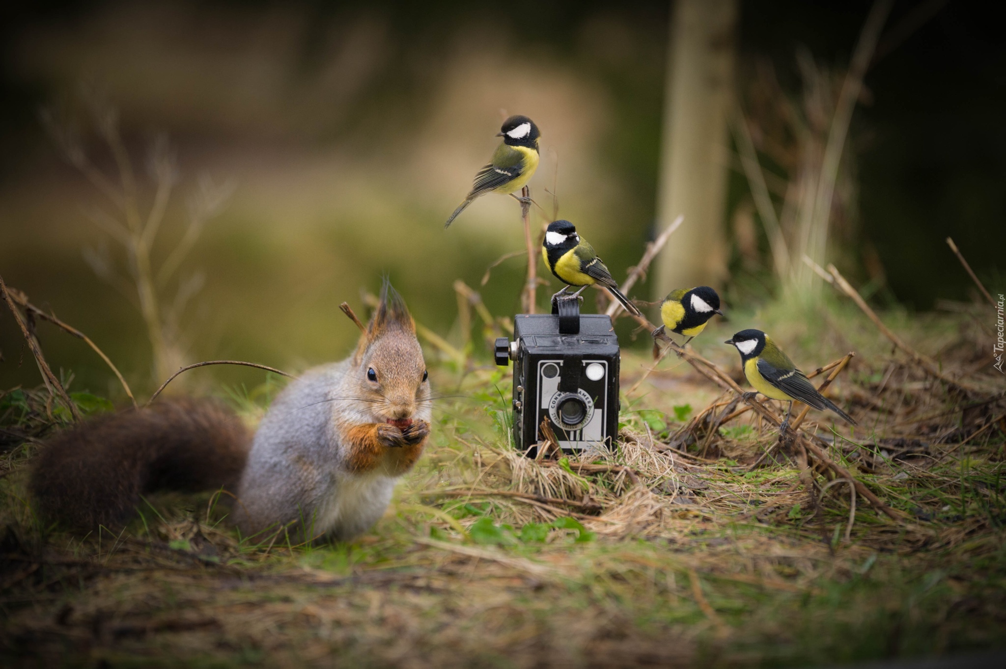 Edytor tapety: Sikorki zainteresowane aparatem fotograficznym i wiewiórka zajadająca orzechy