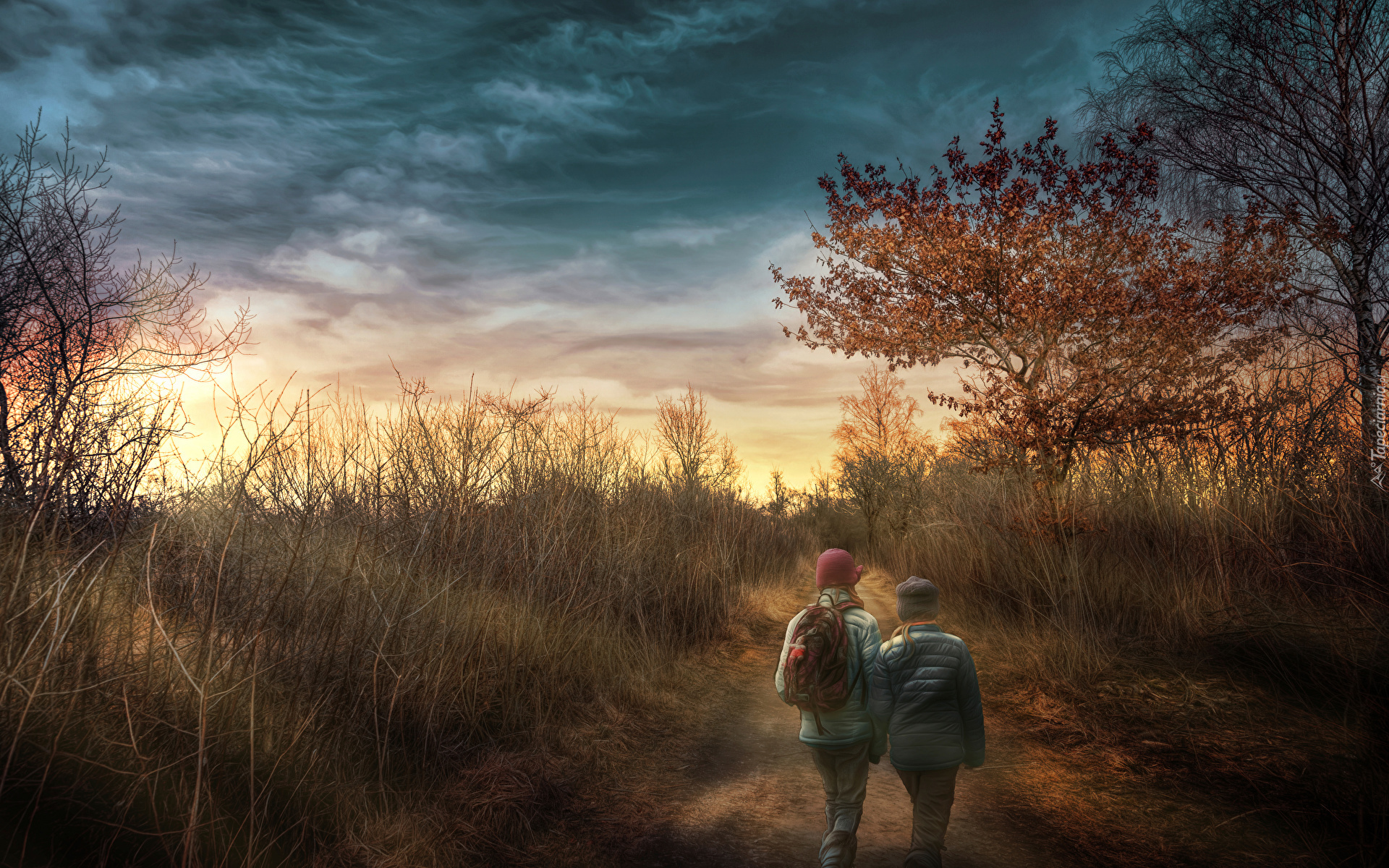Edytor tapety: Dzieci na ścieżce pośród krzewów i drzew