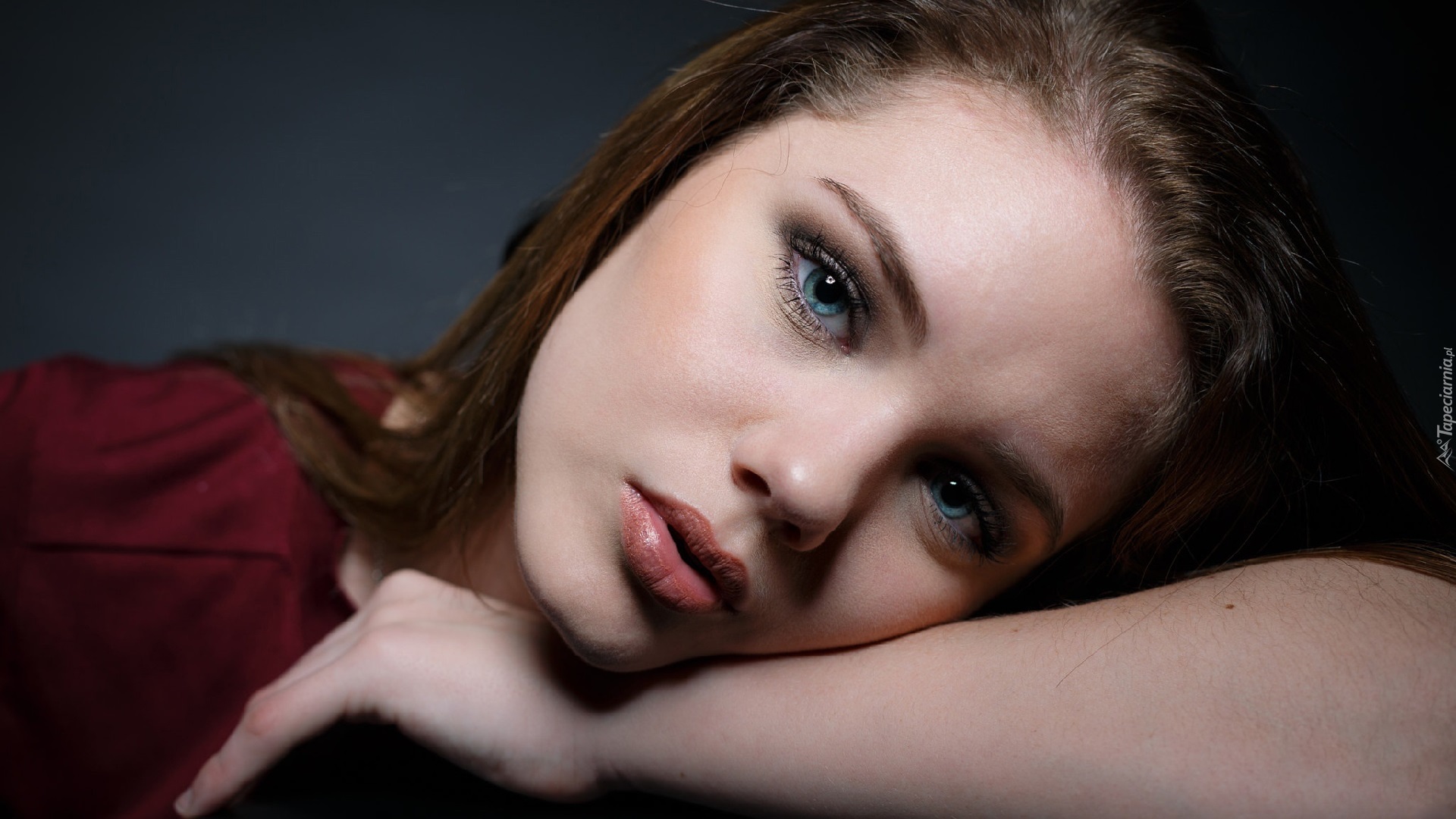 Edytor tapety: Zamyślona niebieskooka szatynka