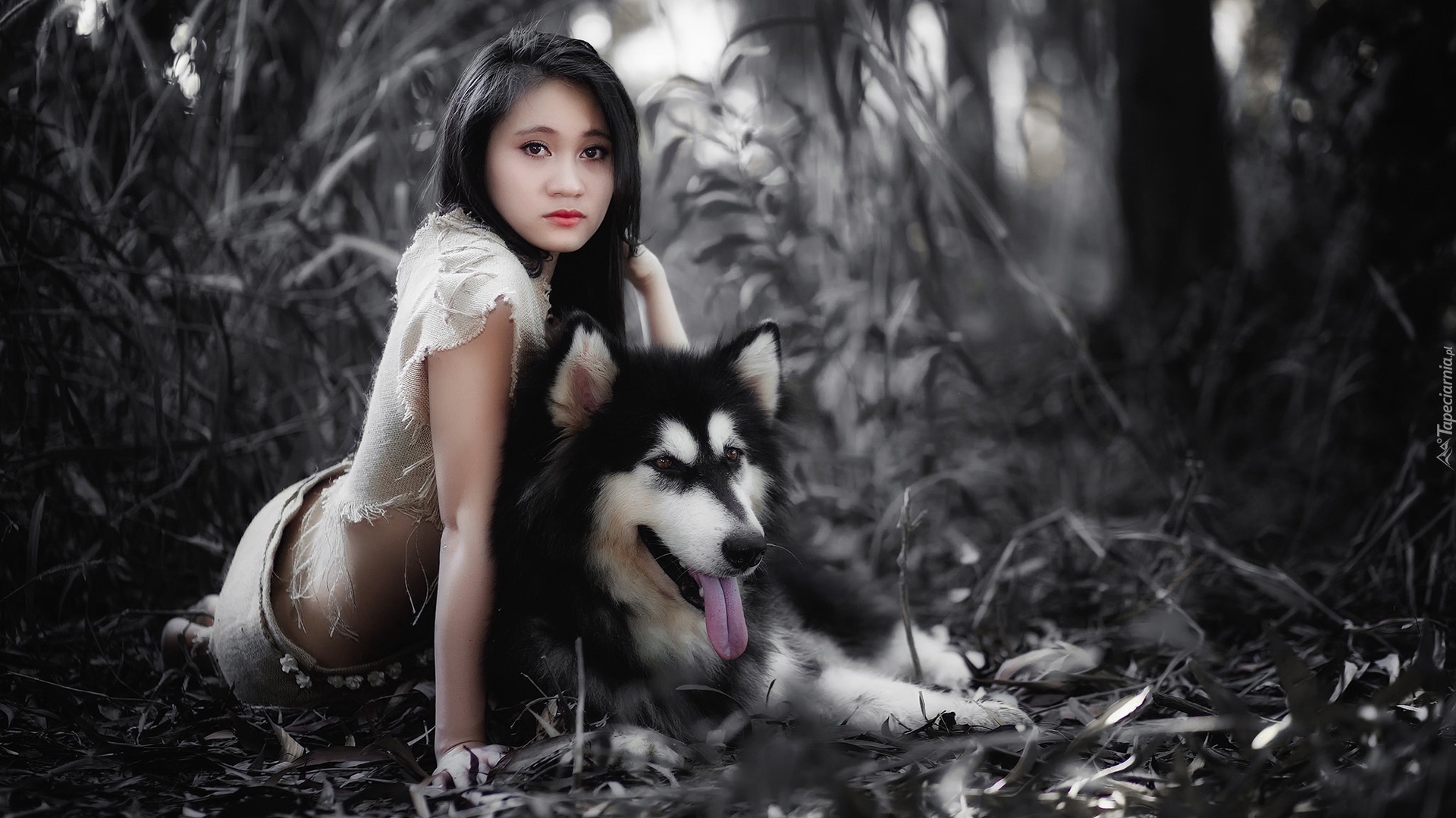 Edytor tapety: Azjatycka kobieta z psem alaskan malamute
