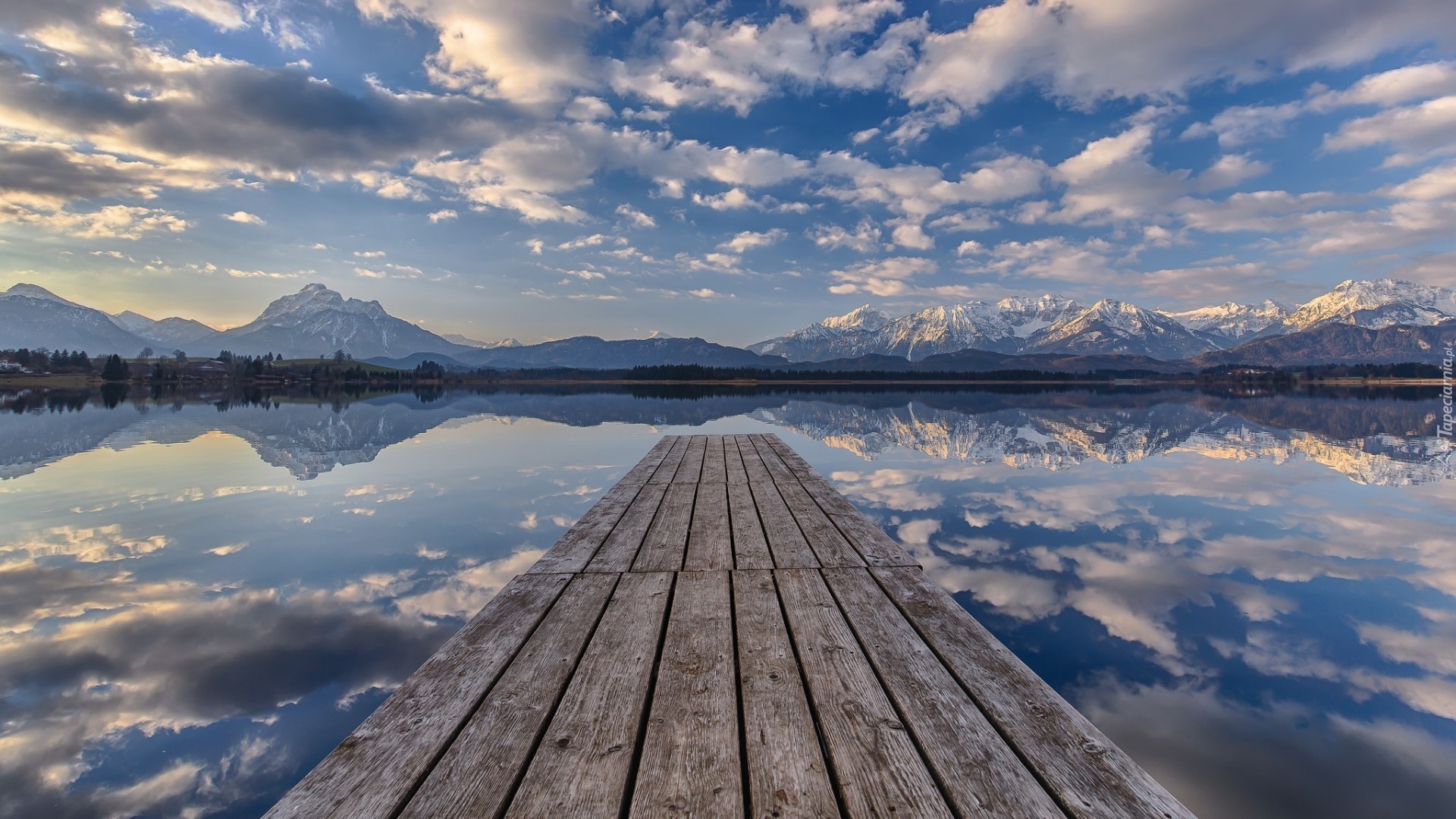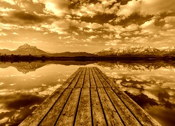 Edytor tapety: Pomost na jeziorze z widokiem na ośnieżone góry