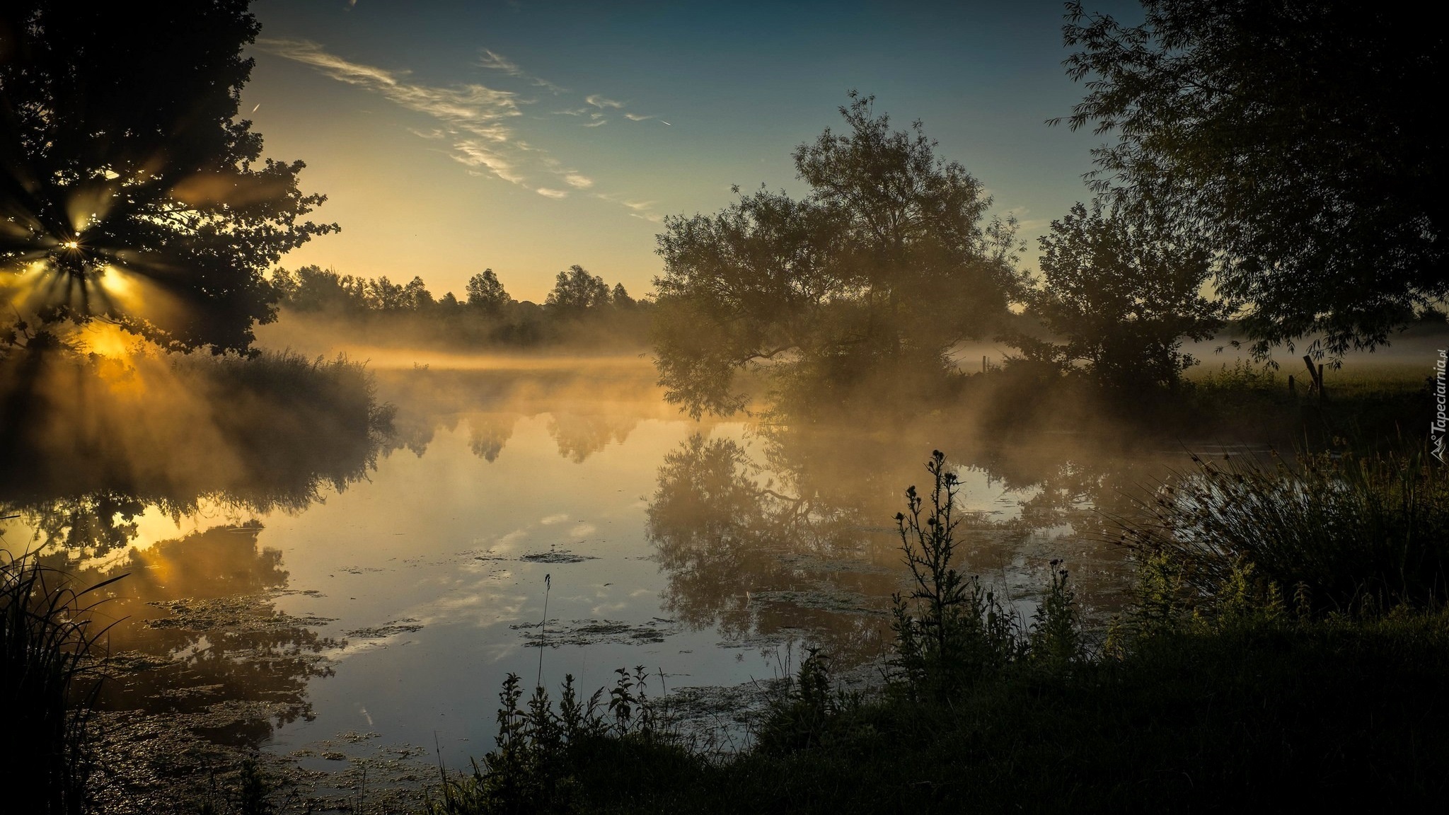 Edytor tapety: Drzewa nad zamgloną rzeką oświetlone promieniami słońca