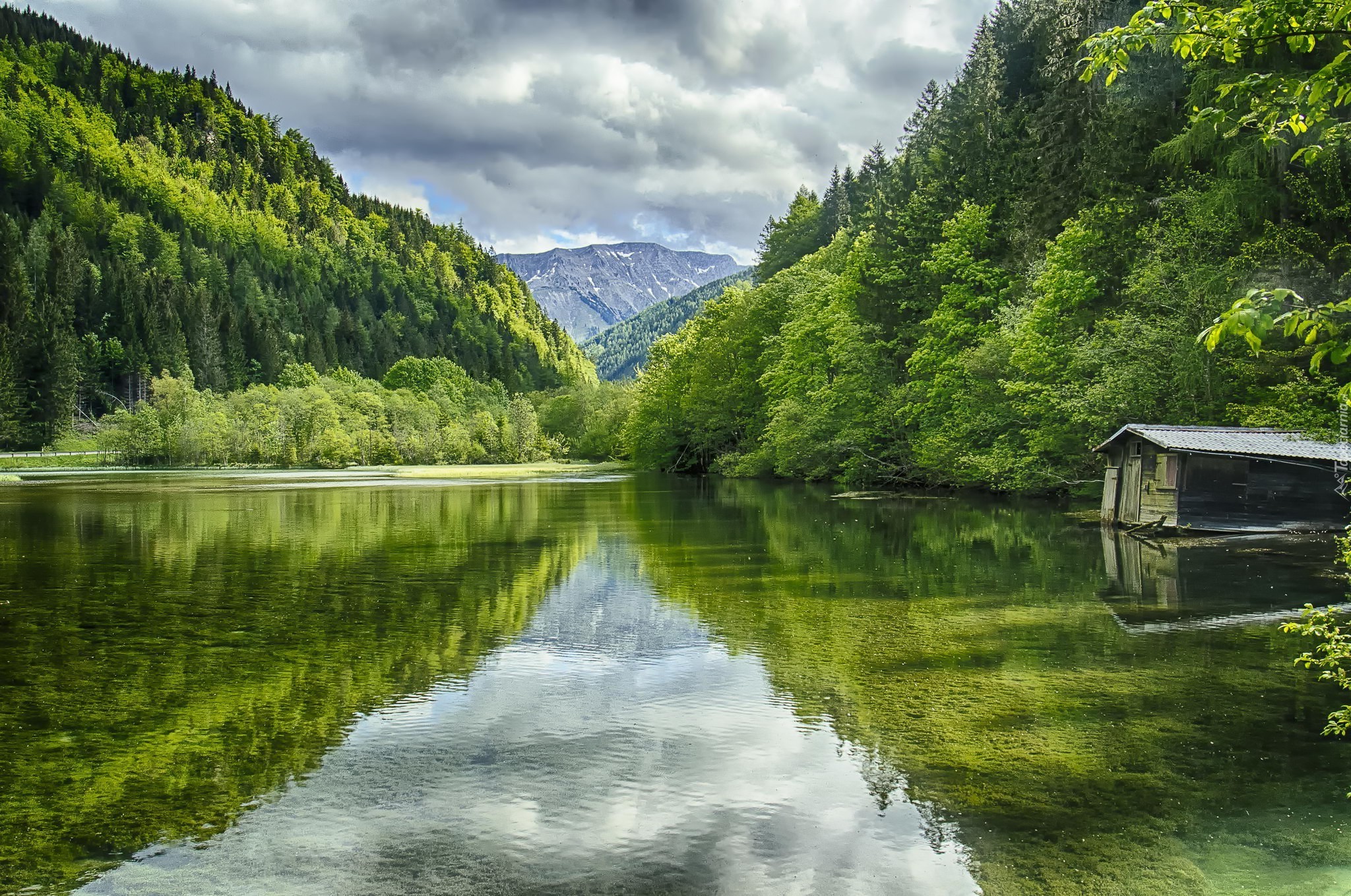 Edytor tapety: Drewniana chata na jeziorze