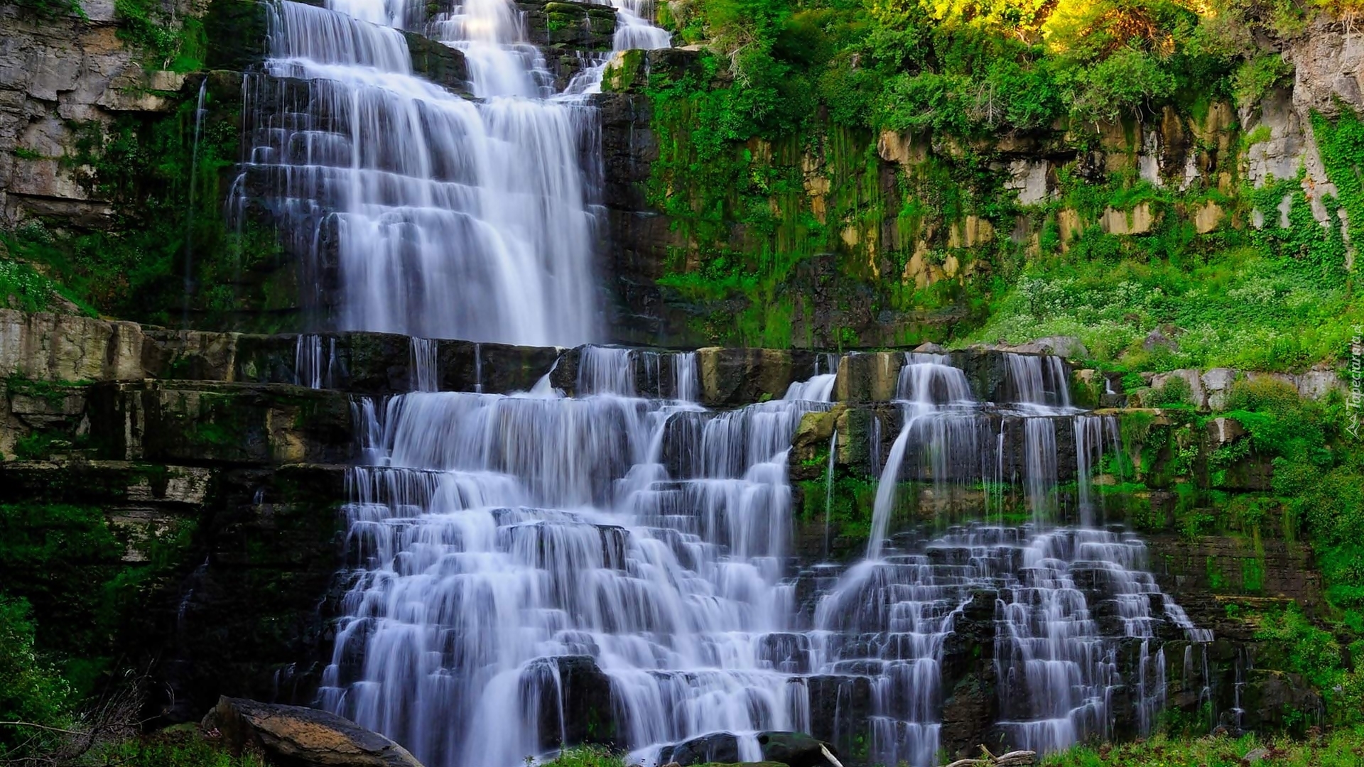 Edytor tapety: Wodospad na skałach porośniętych roślinami