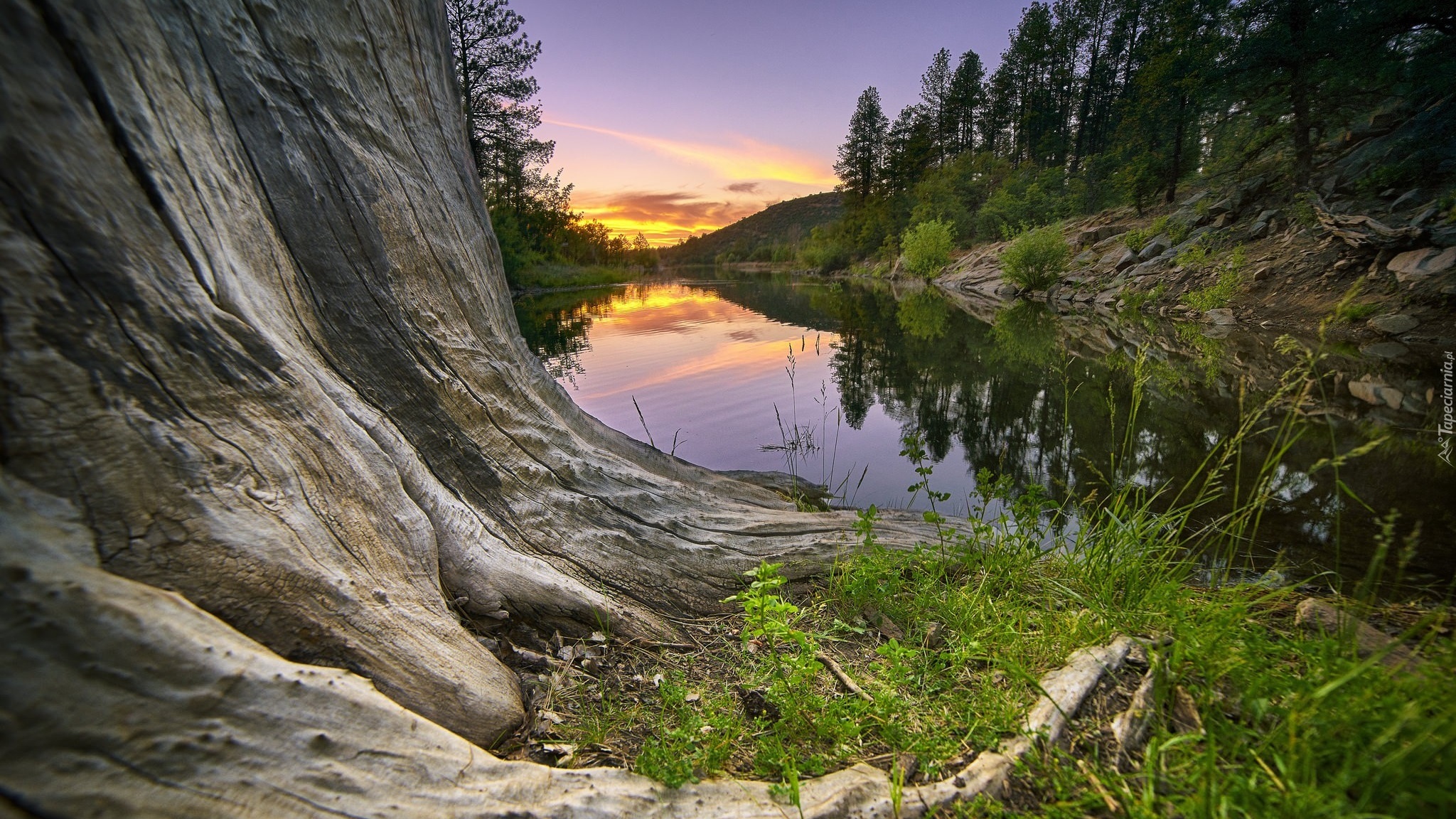 Edytor tapety: Pień starego drzewa nad rzeką o zachodzie słońca