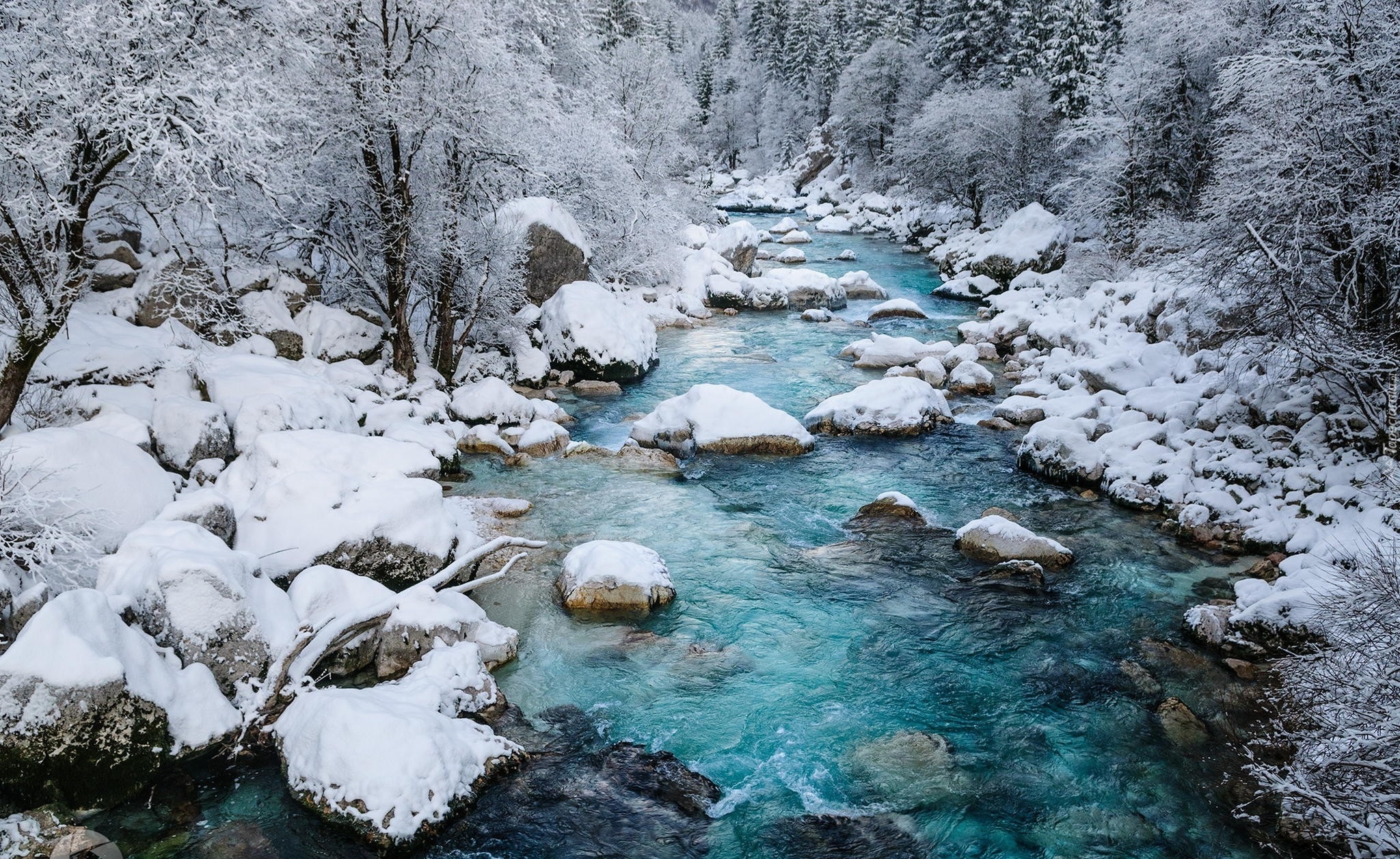 Edytor tapety: Rzeka Socza w Słowenii zimą