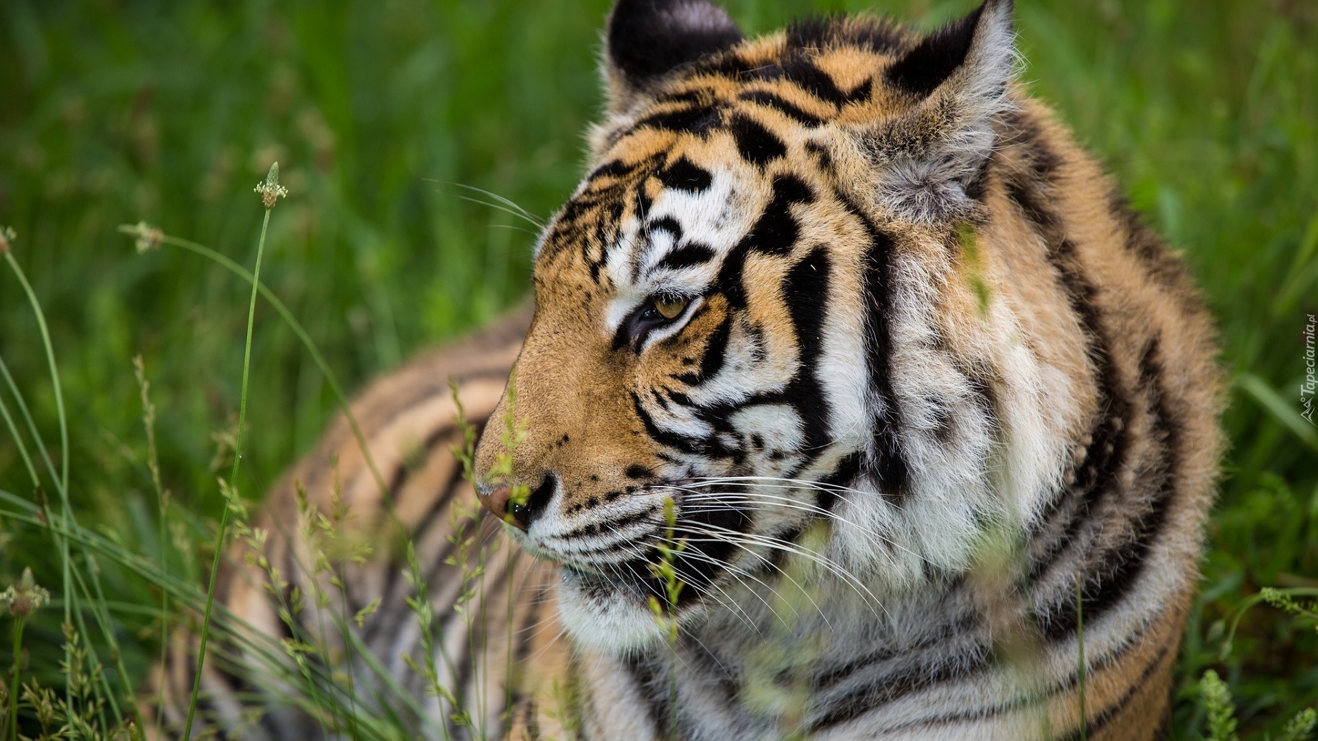 Edytor tapety: Tygrys odpoczywa w trawie