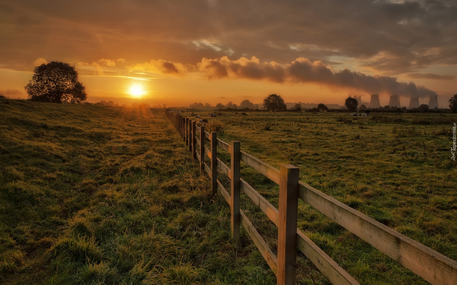 Edytor tapety: Zachód słońca nad polami i łąkami