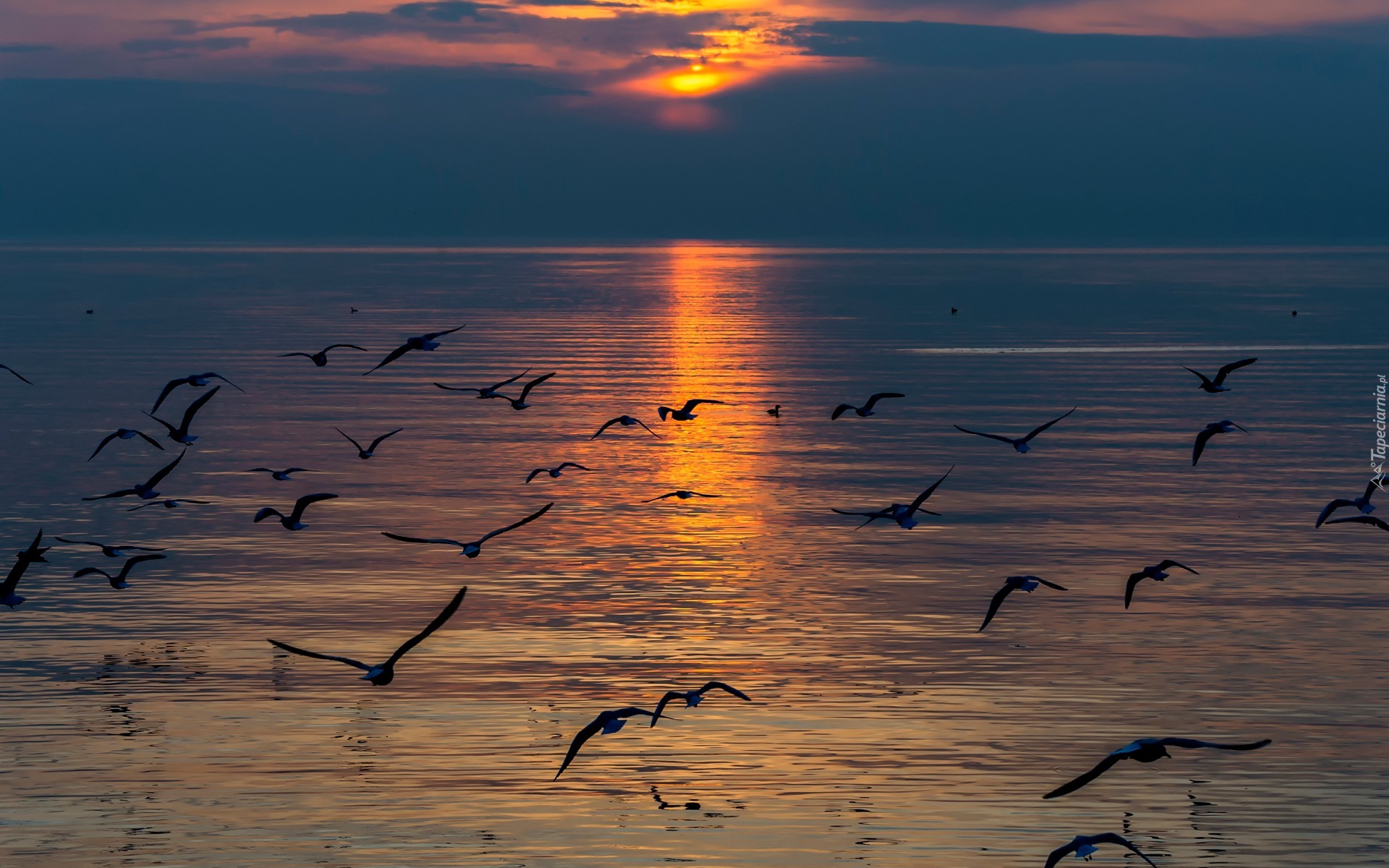 Edytor tapety: Mewy nad morzem o zachodzie słońca