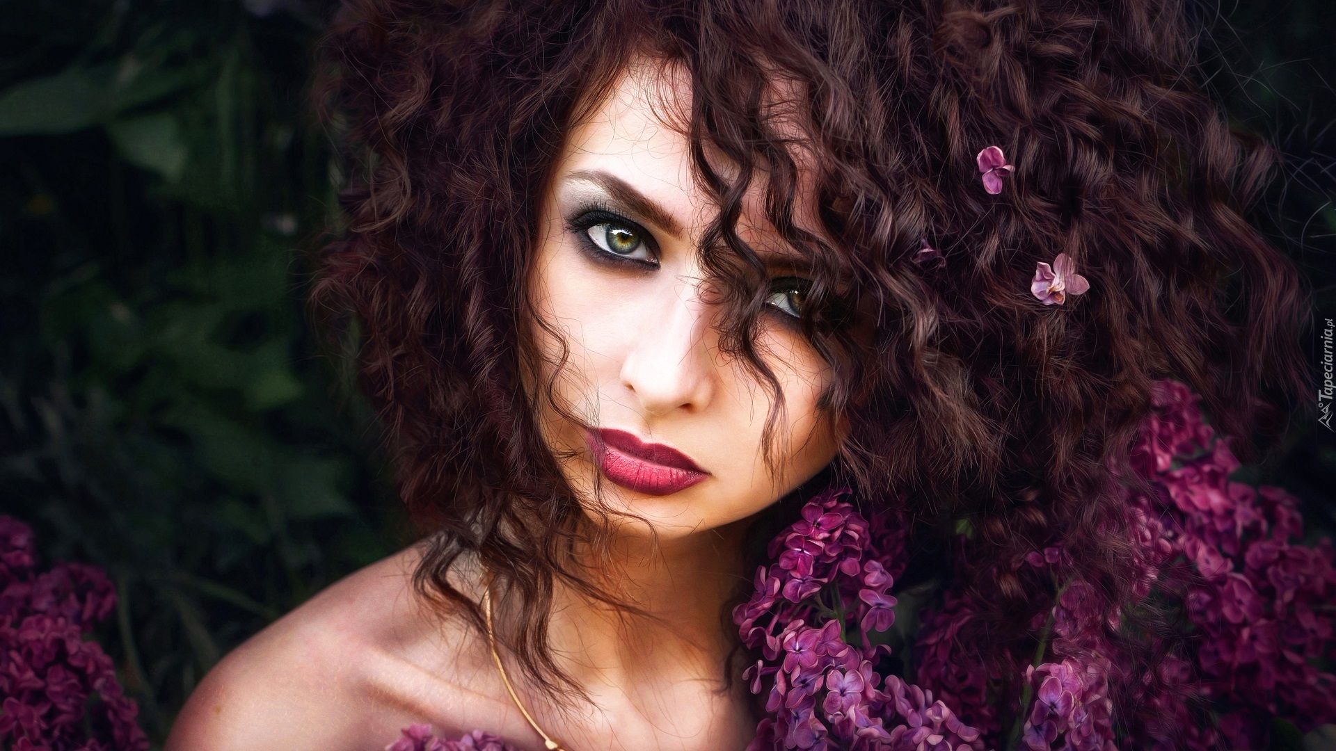 Edytor tapety: Kobieta o ciemnych włosach obok kwiatów bzu