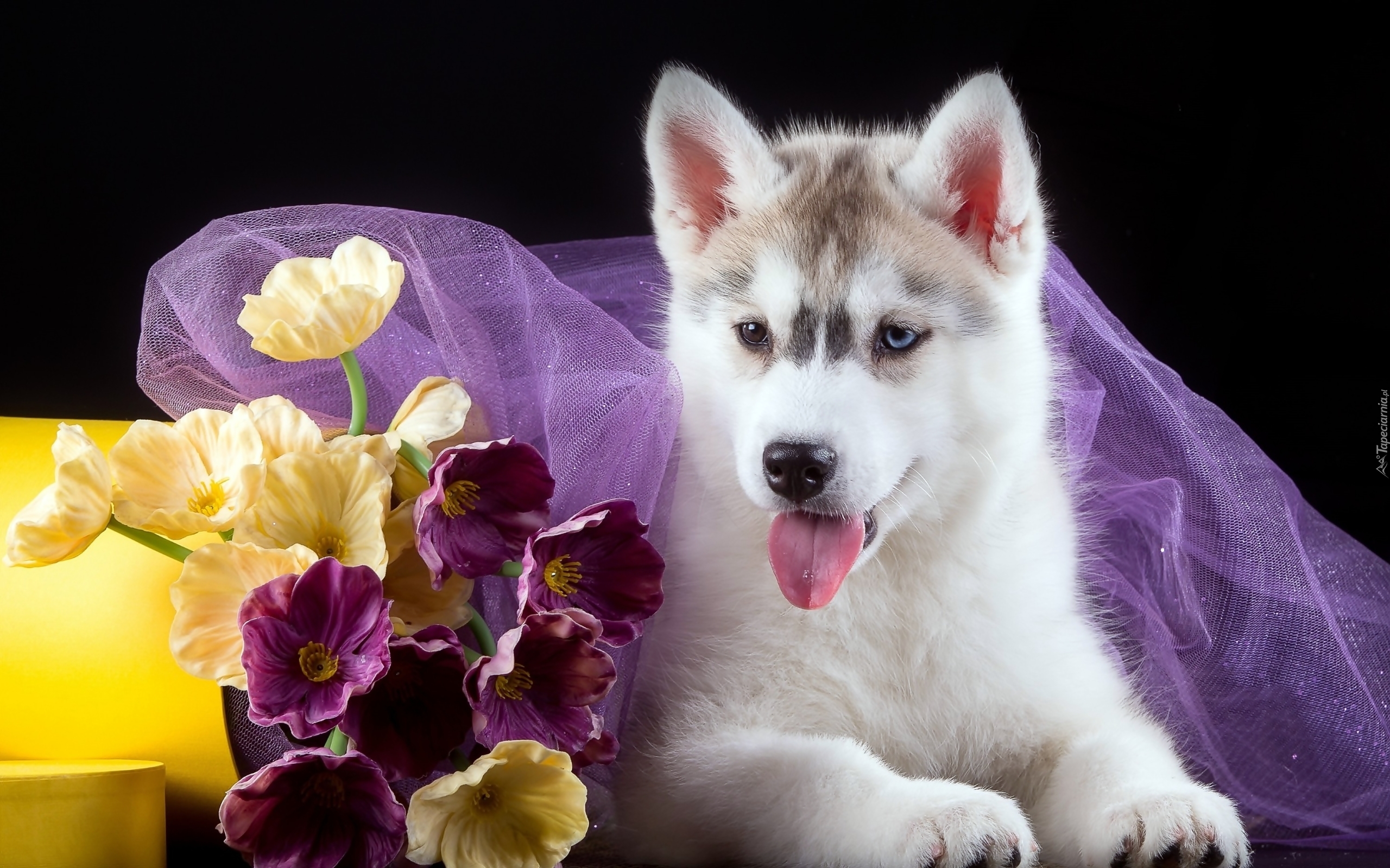 Edytor tapety: Szczeniak siberian husky obok bukietu kwiatów