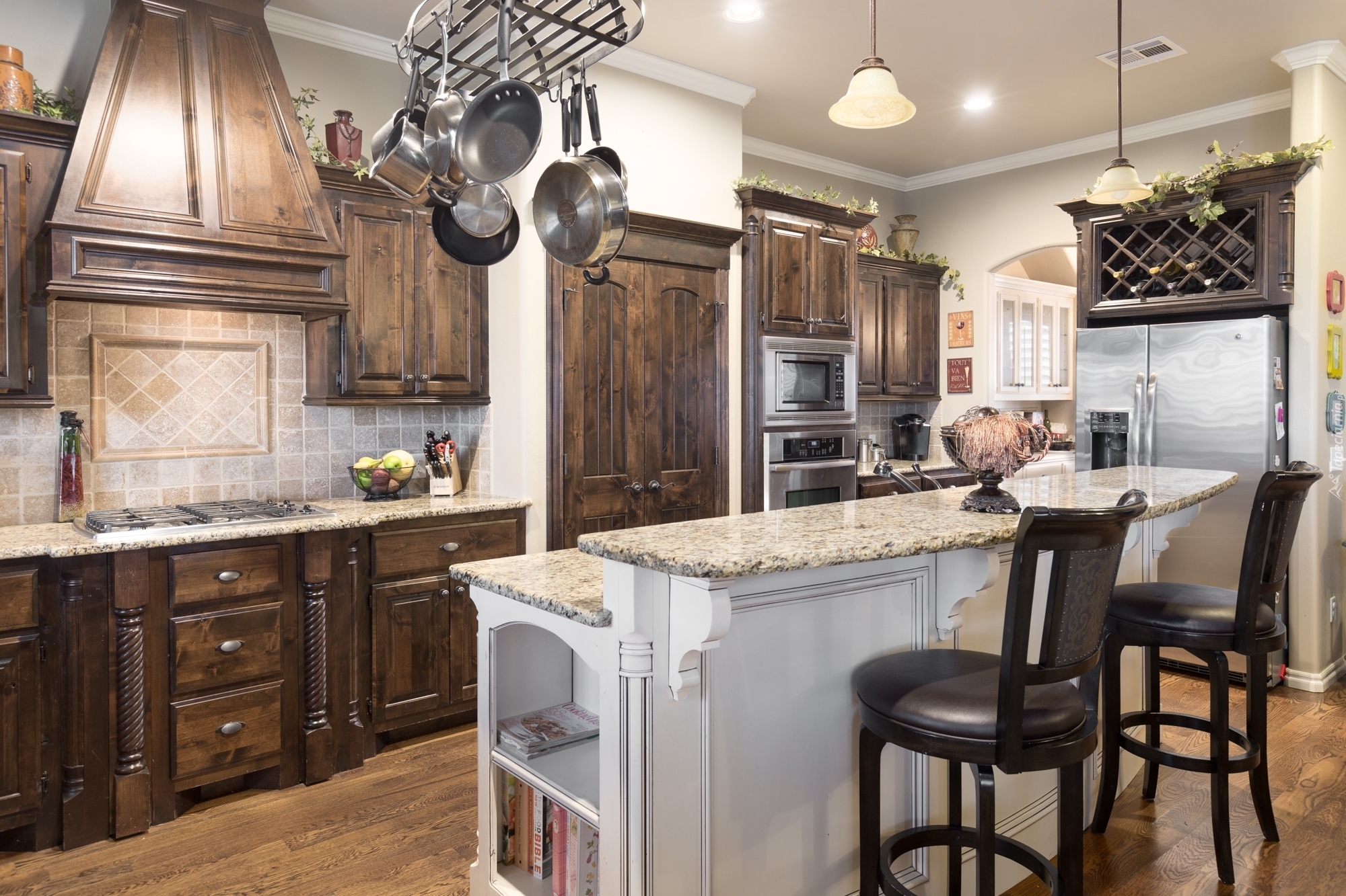 Edytor tapety: Umeblowana kuchnia z wiszącymi patelniami