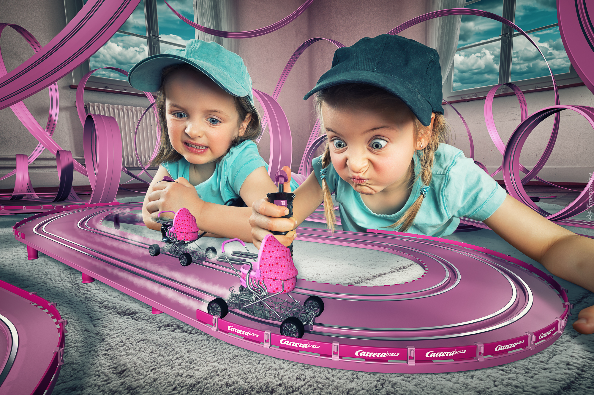 Edytor tapety: Dziewczynki bawiące się w wyścigi wózków na torze