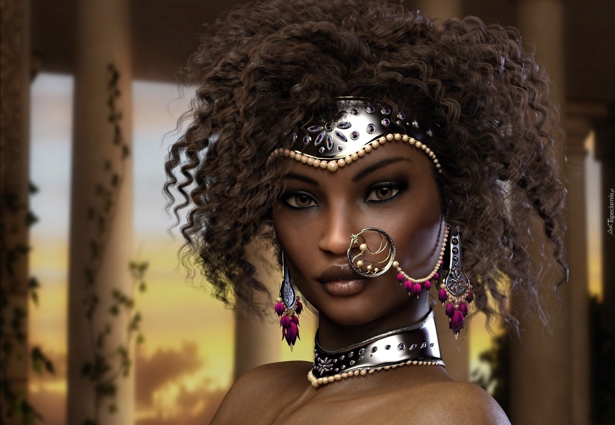 Edytor tapety: Mulatka z kręconymi włosami i w wyszukanej biżuterii