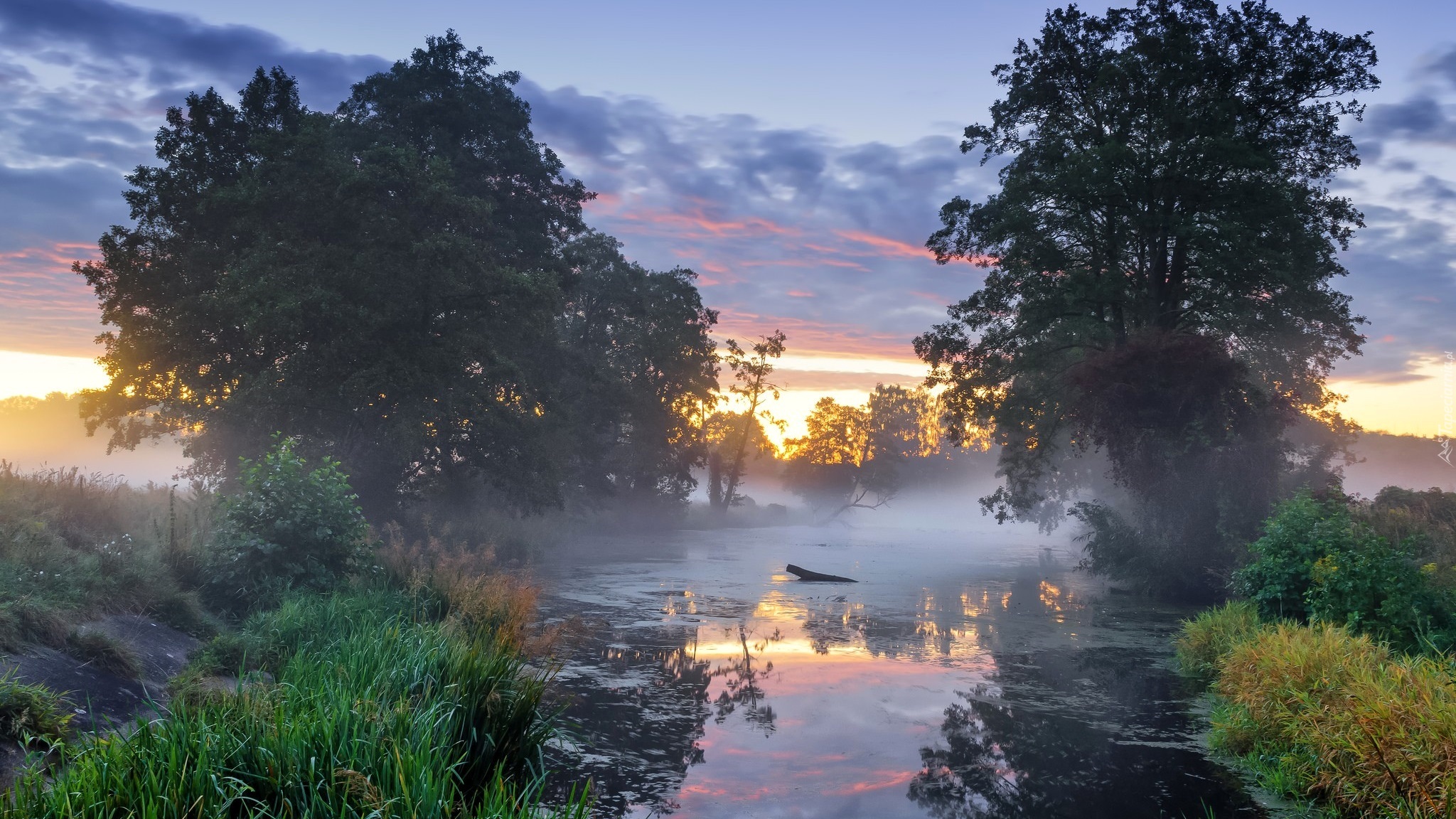 Edytor tapety: Drzewa nad rzeką w mglisty poranek