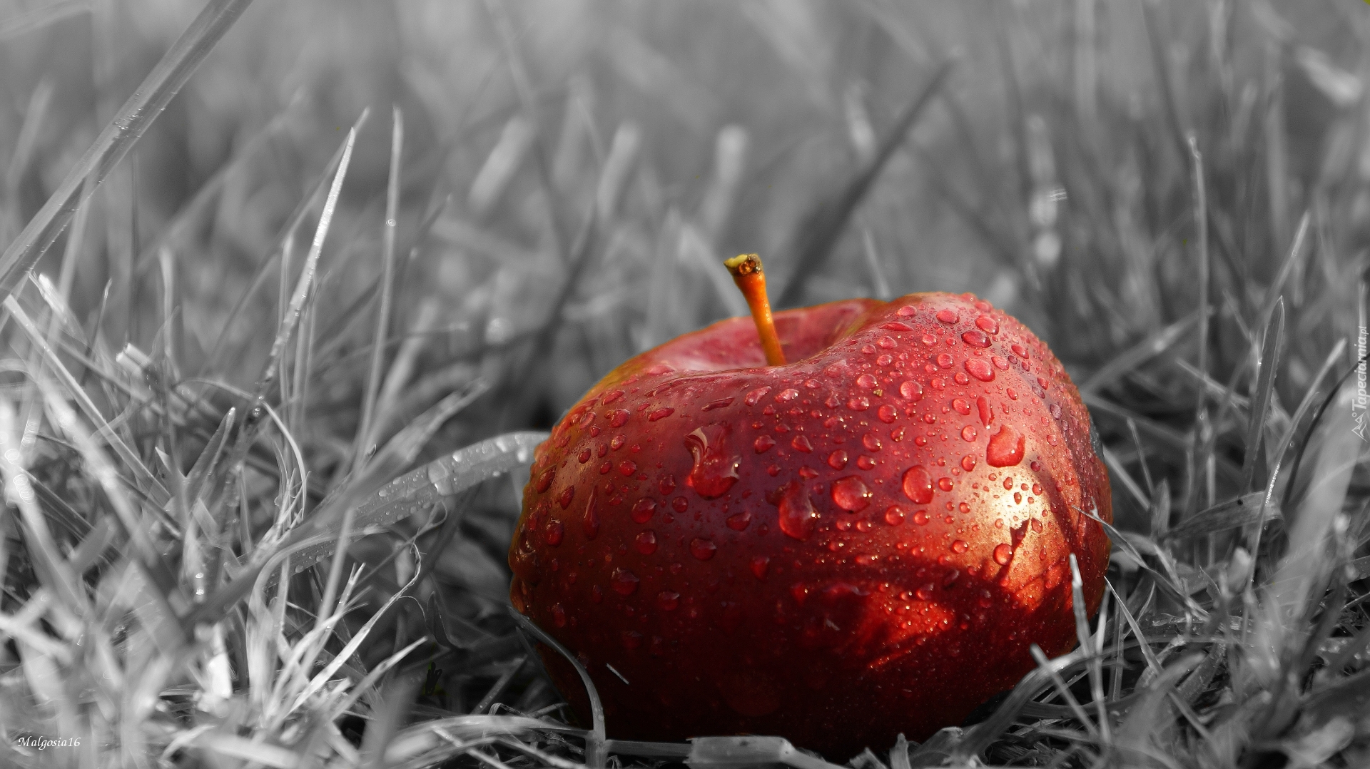 Edytor tapety: Krople wody na czerwonym jabłku