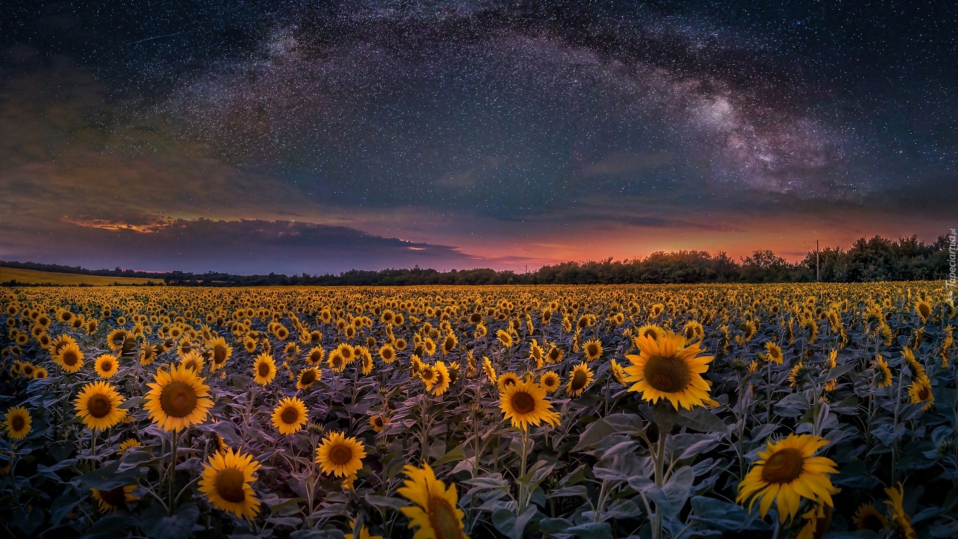 Edytor tapety: Gwieździste niebo nad polem słoneczników