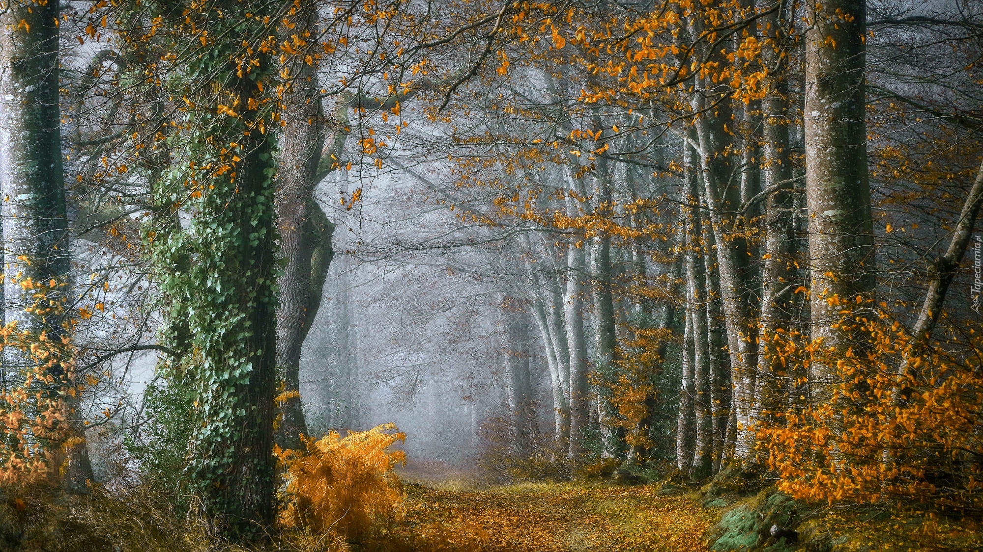 Edytor tapety: Jesienne liście na drodze i drzewach w lesie