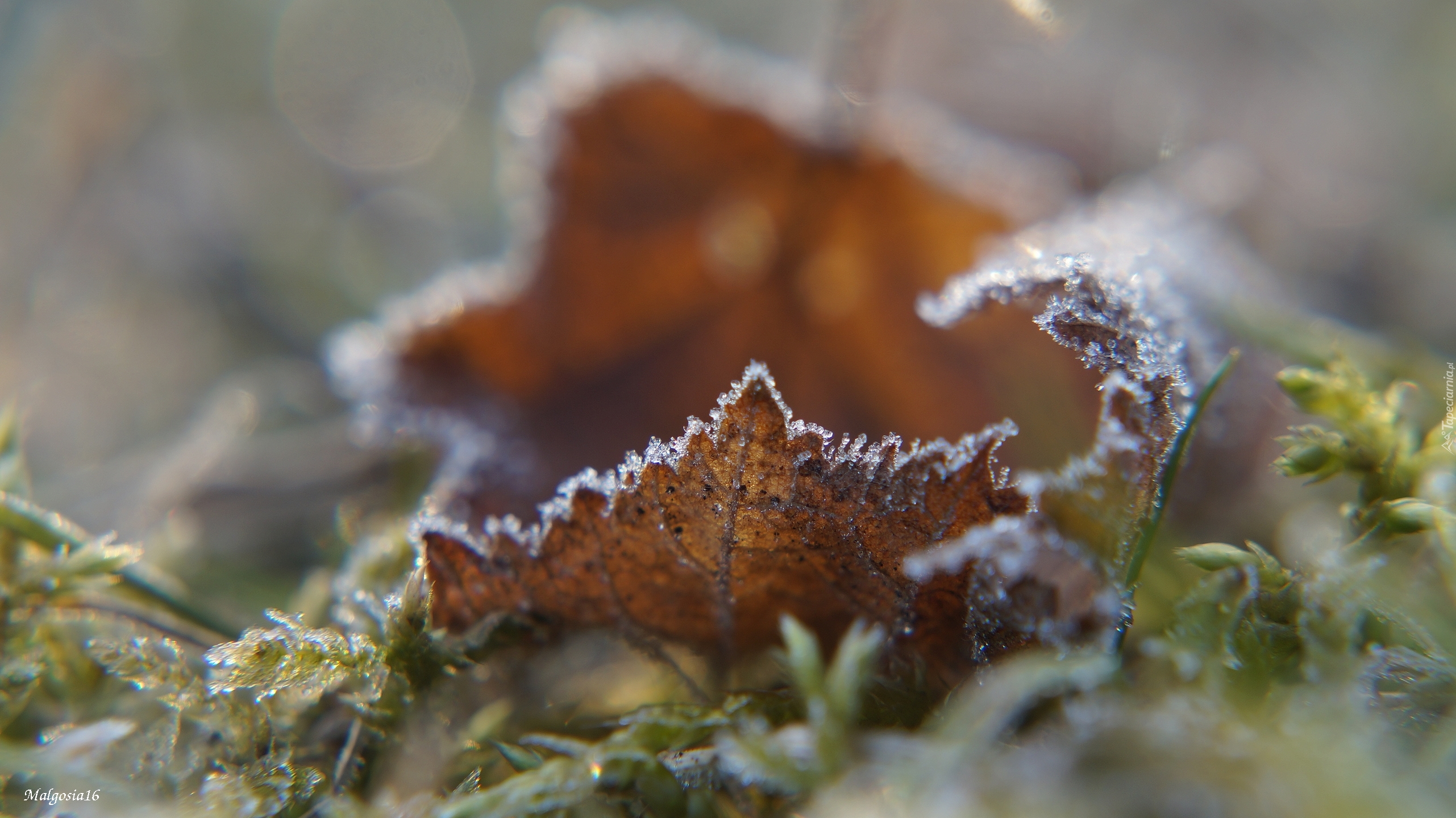 Edytor tapety: Uschnięty liść pokryty szronem z bliska