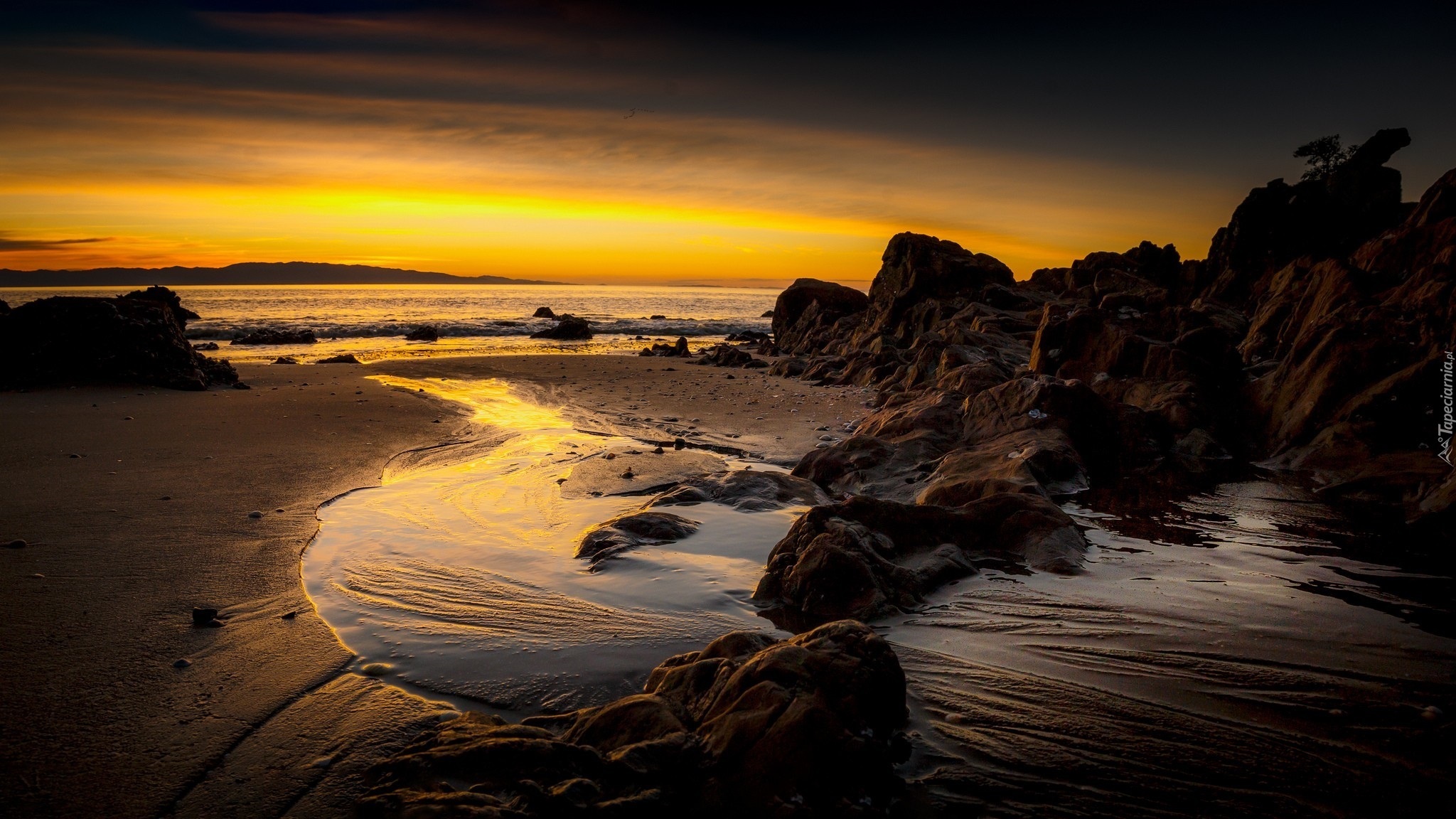 Edytor tapety: Morskie skalne wybrzeże w blasku zachodzącego słońca
