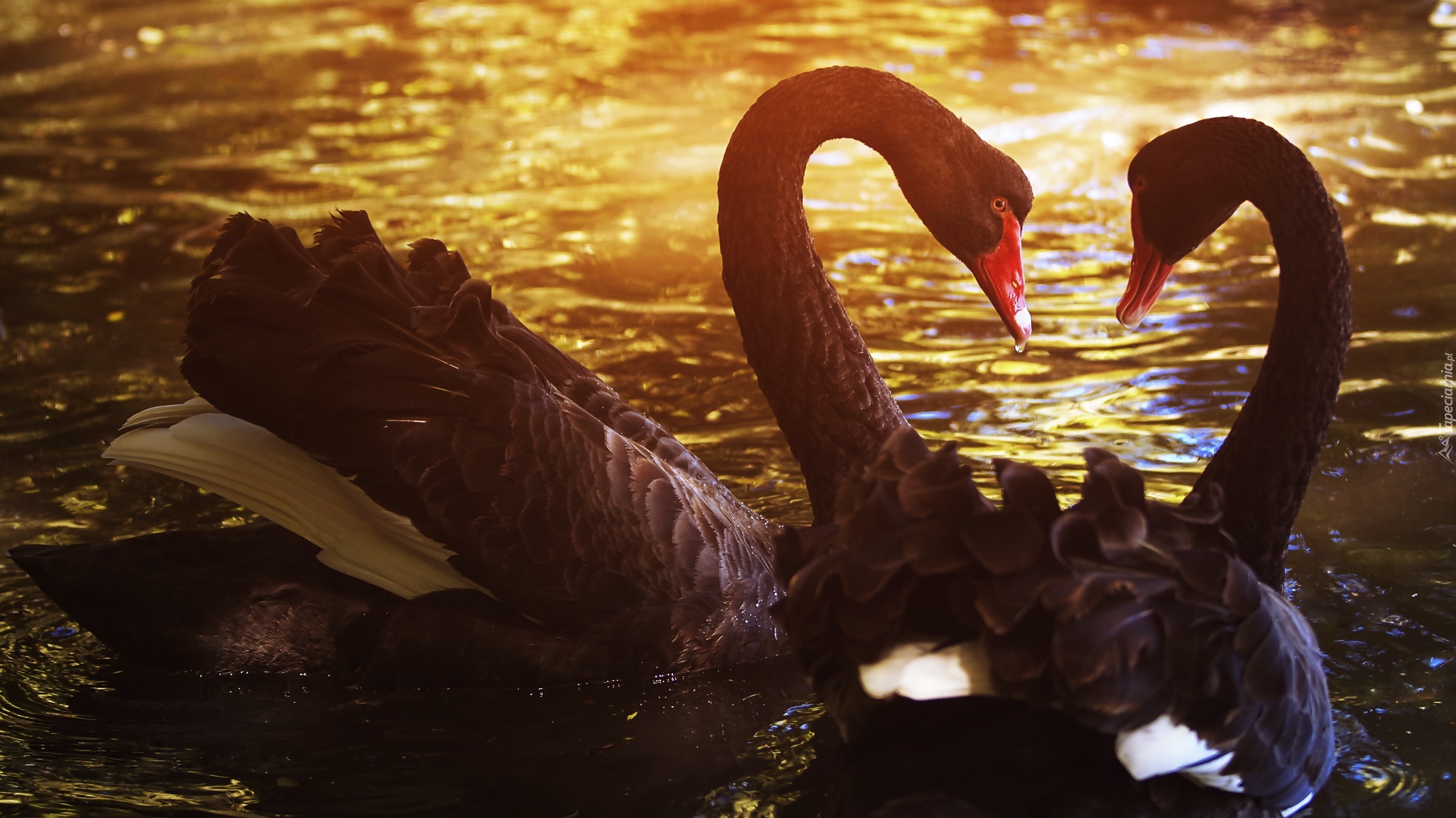 Edytor tapety: Czarne łabędzie na wodzie o zachodzie słońca