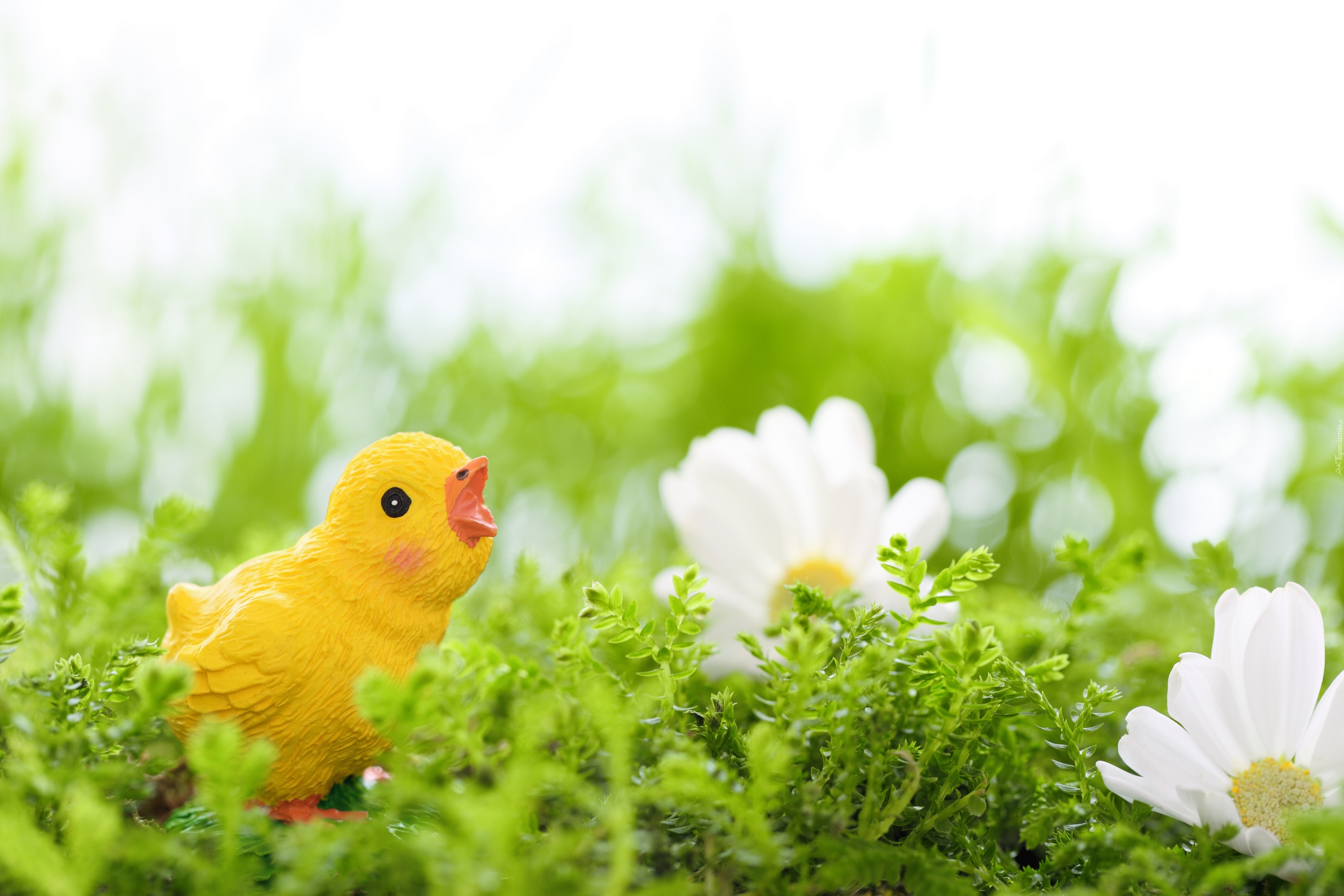 Edytor tapety: Figurka wielkanocnego kurczaczka między kwiatkami