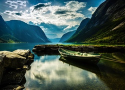 Edytor tapety: Łódka przy fiordzie Sognefjorden w norweskim regionie Sogn og Fjordane