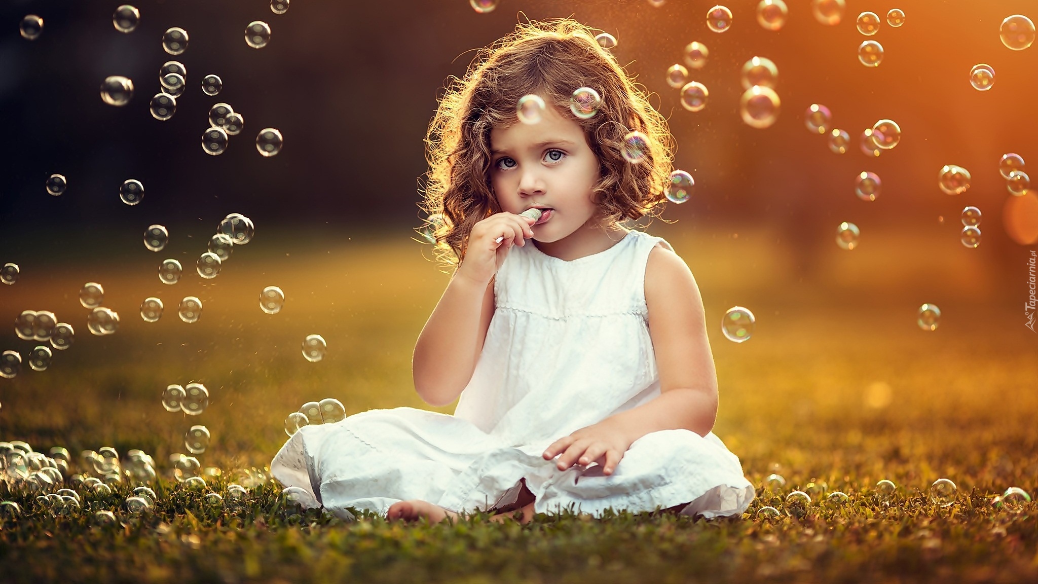 Edytor tapety: Fruwające bańki mydlane wokół dziewczynki w sukience